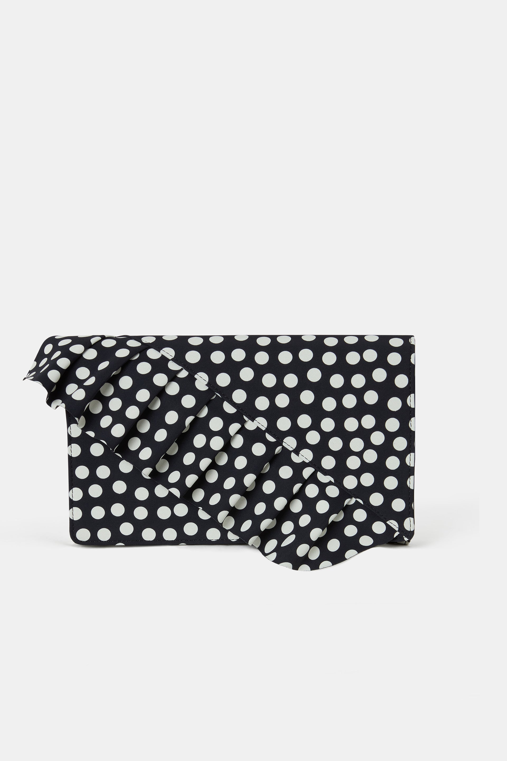The great return of an incon: Capri clutch bag in printed fabric with polka dot pattern. The rectangular shape, front flap closure with decorative ruffle detail on the flap this bag has a structured design to elevate your look. Wear it with the matching seasonal items.