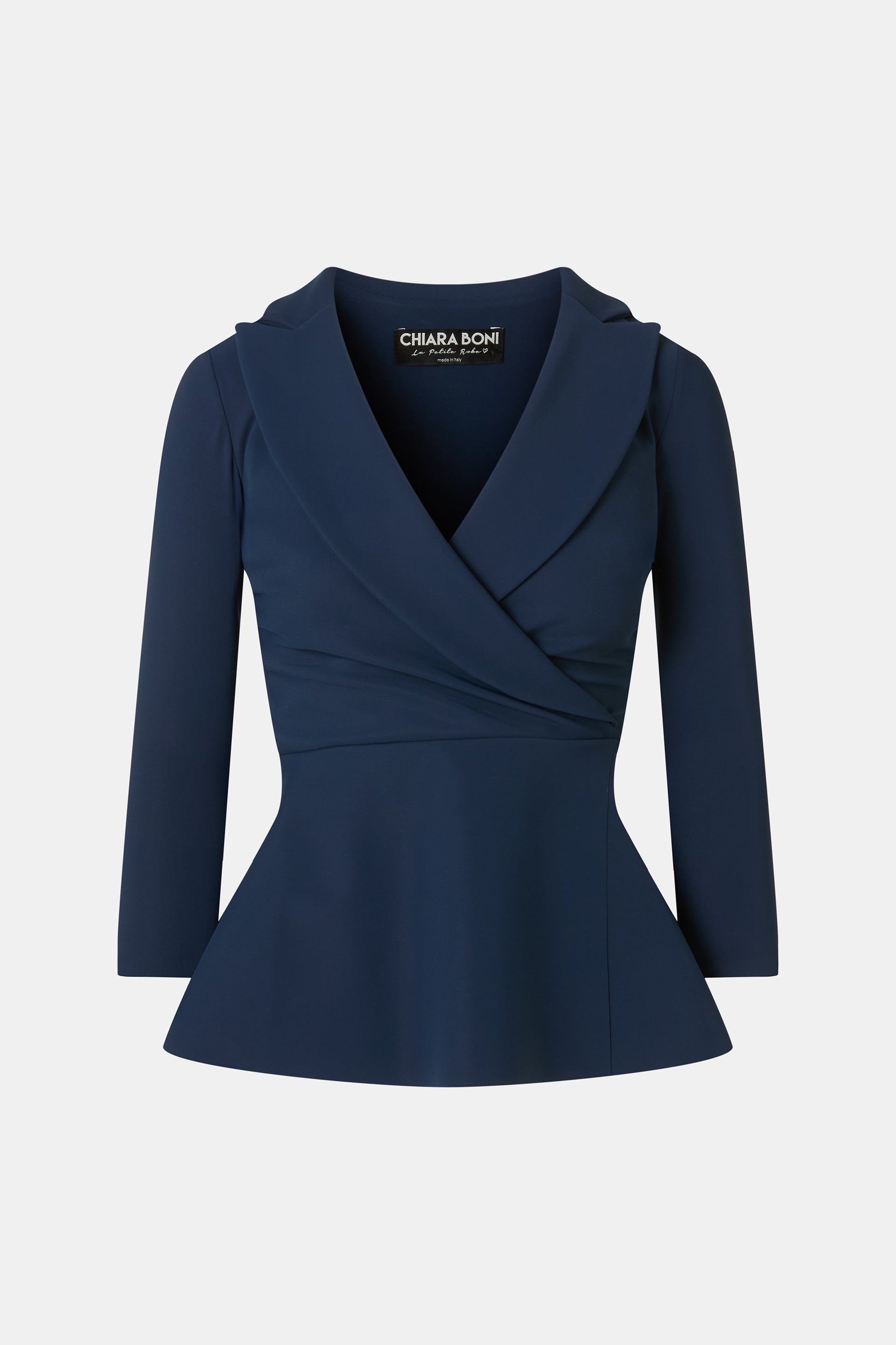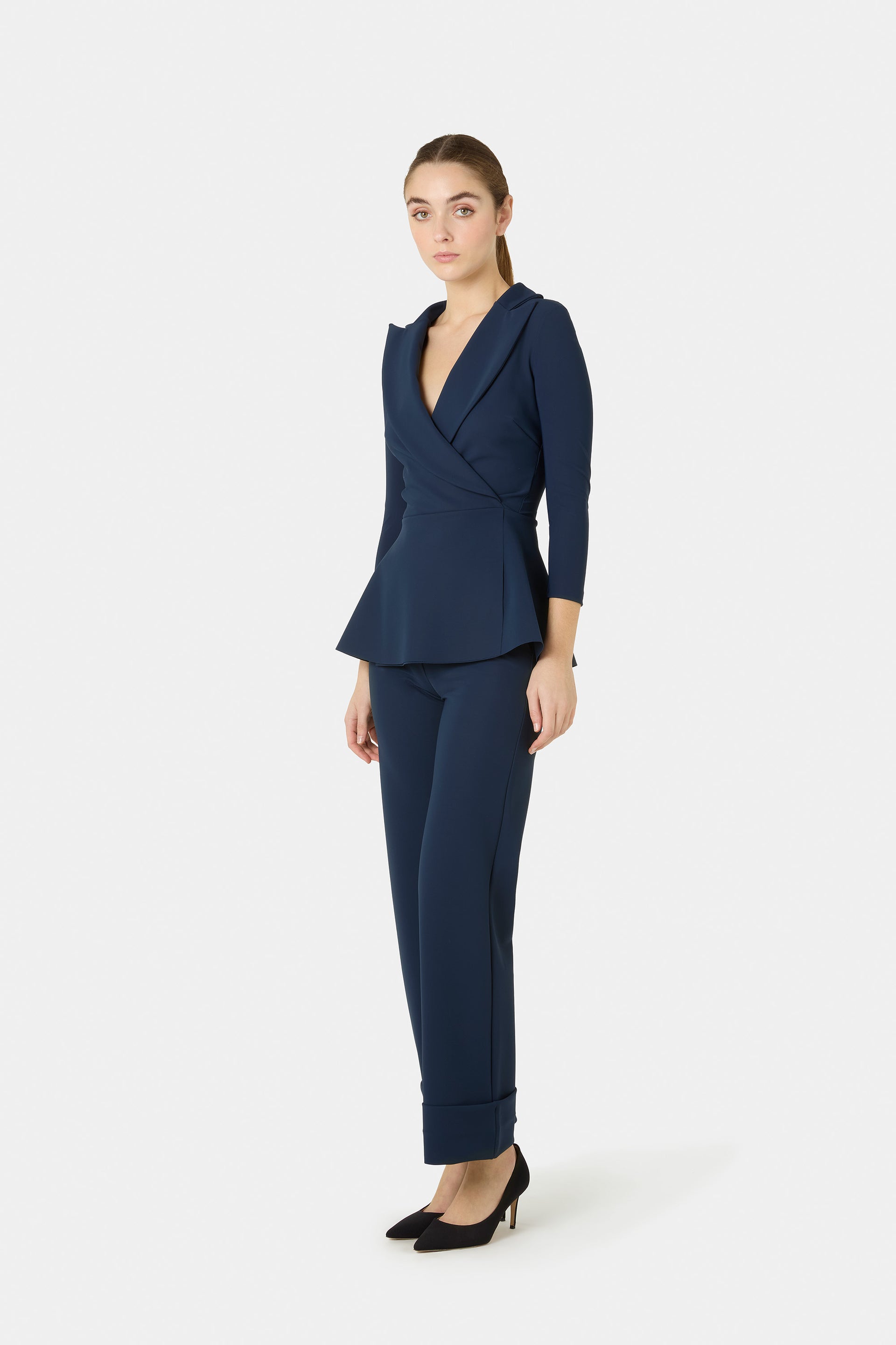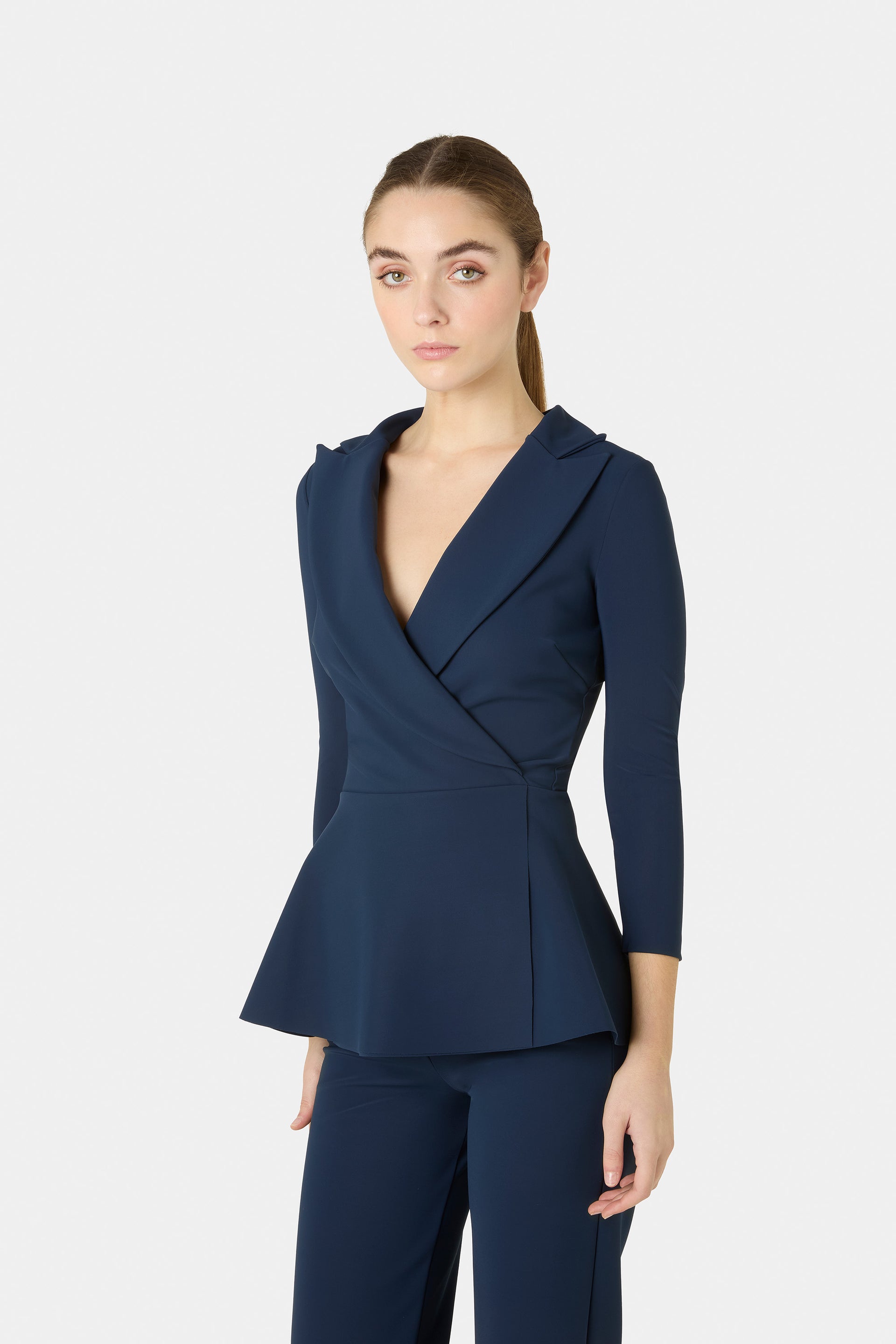 The classic lapels of a smoking jacket enhance the Dominy top. Ideal to wear over tone-on-tone skinny or flared pants for a CHIARA BONI-style jumpsuit effect.