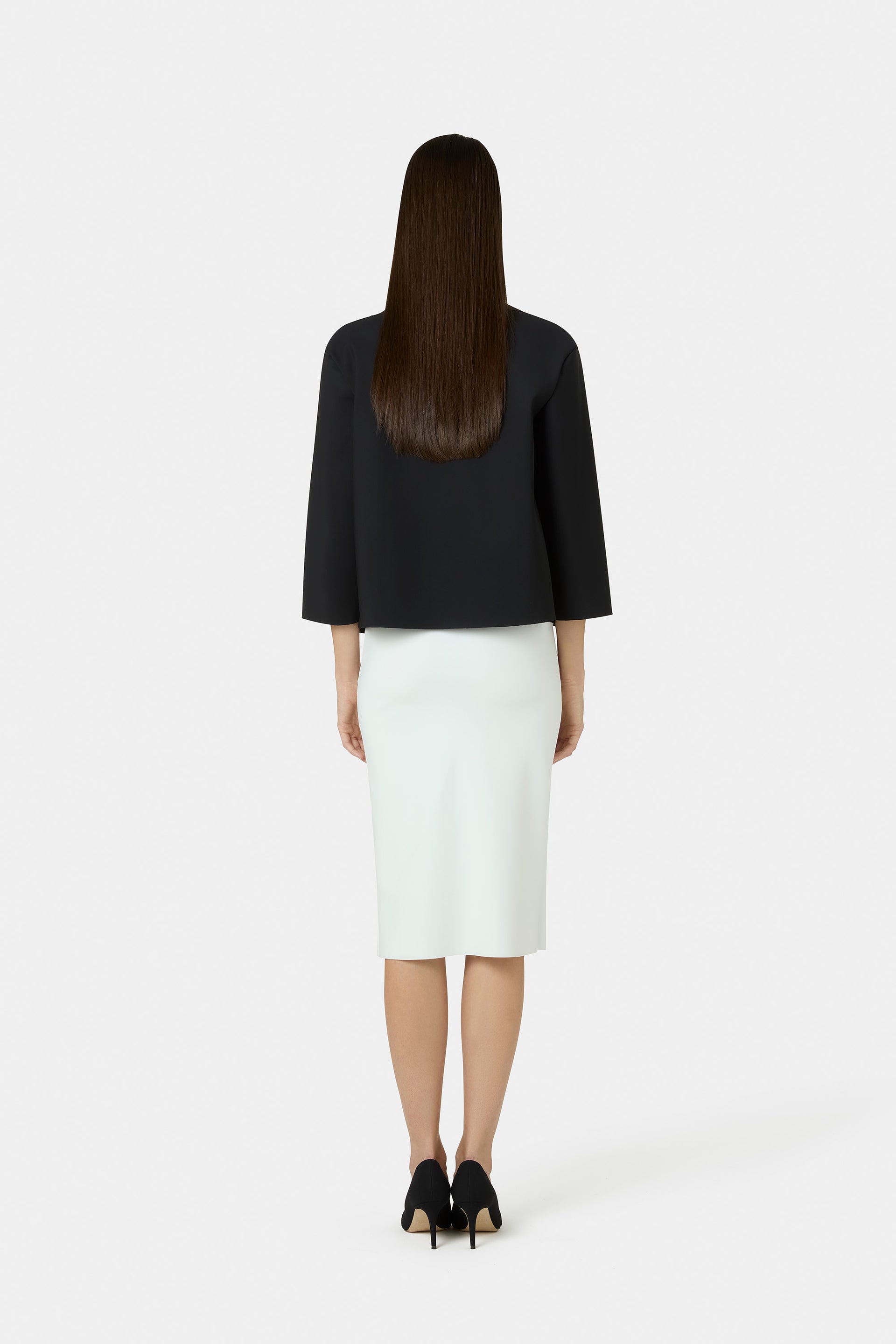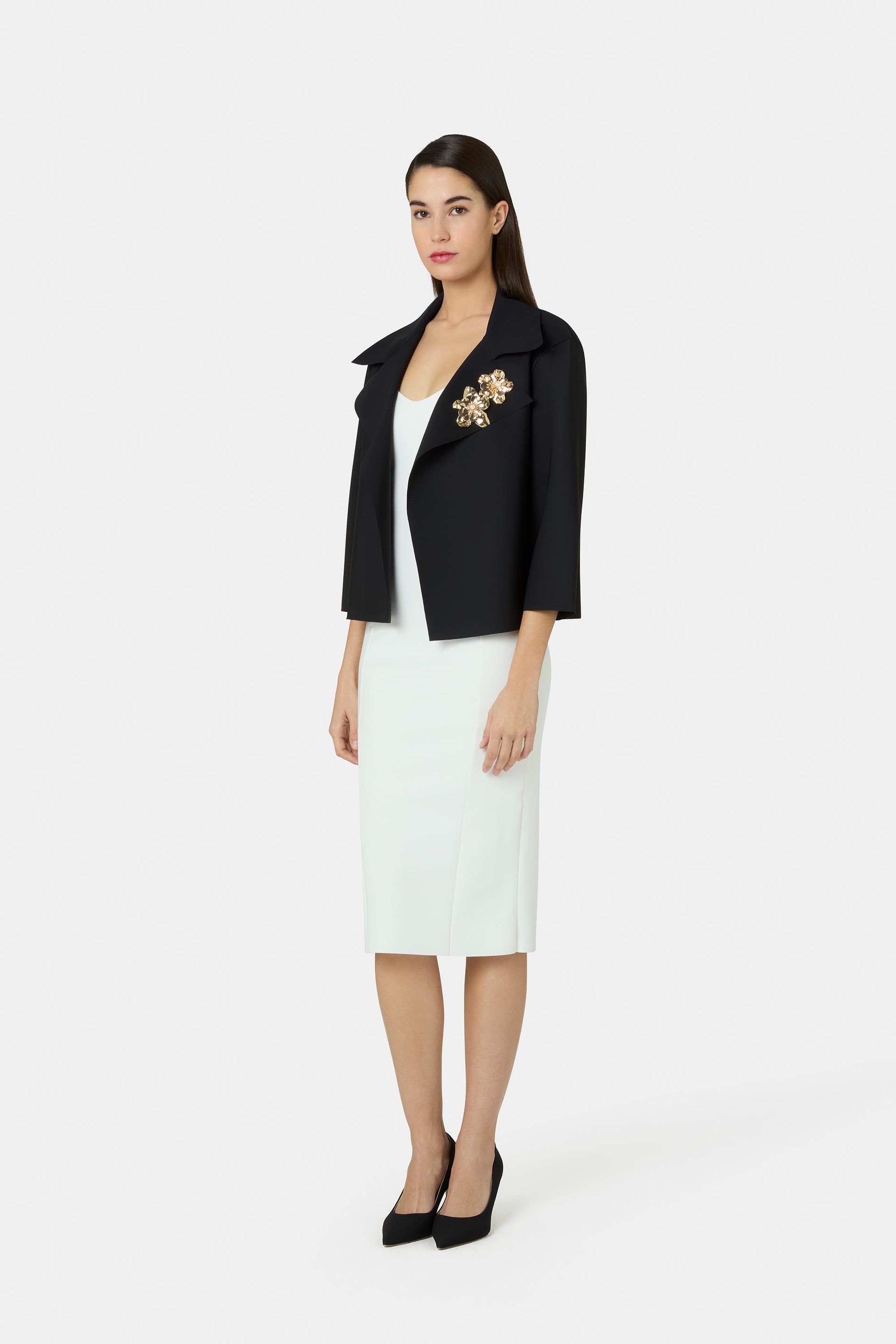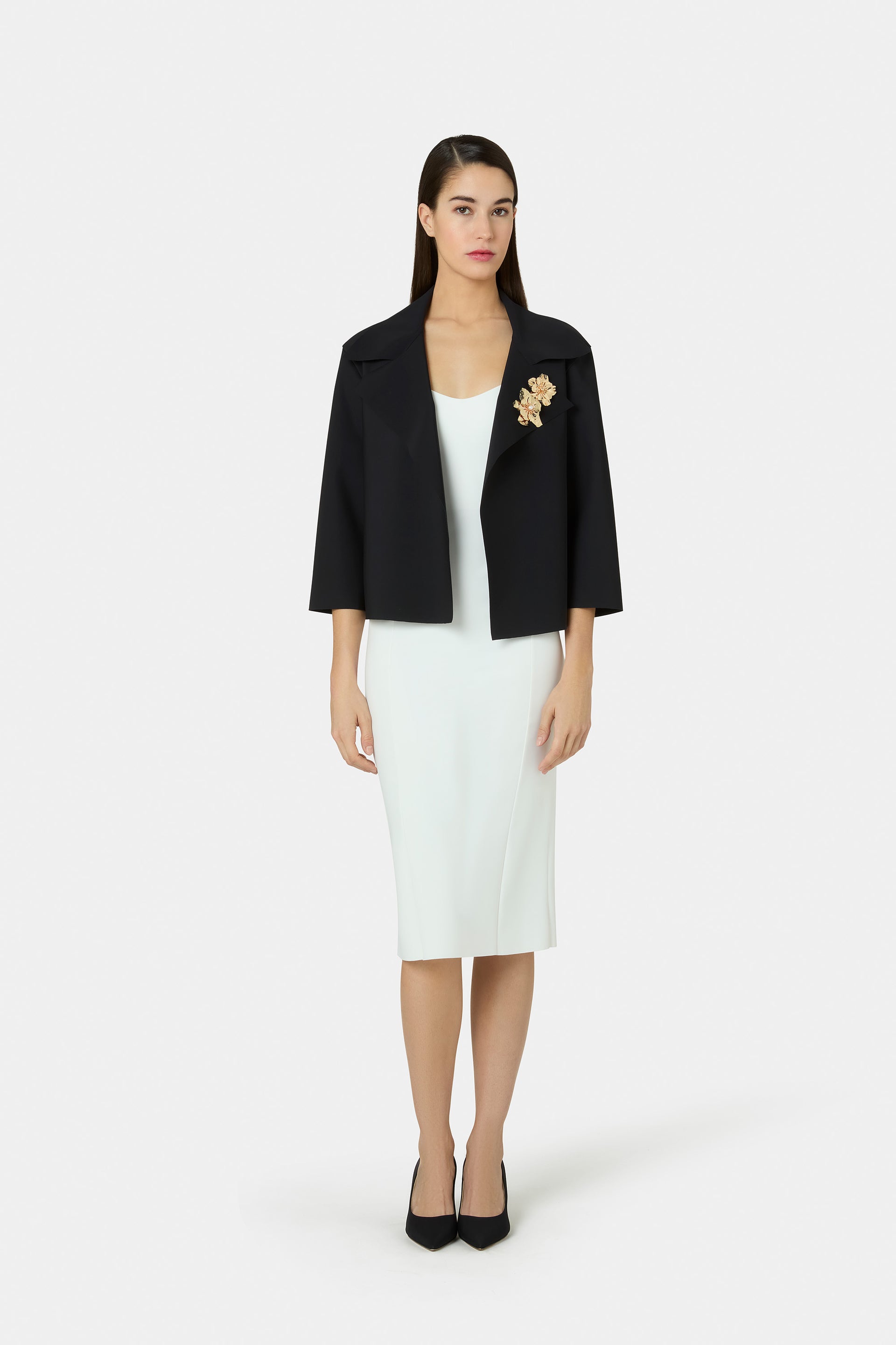 The Iky cape is the season’s most sophisticated alternative to a classic coat. Its double-breasted cut and wide sleeves drape the silhouette with effortless, contemporary elegance. The sparkling brooch adds a luminous, precious touch, elevating the piece into a true statement of style.