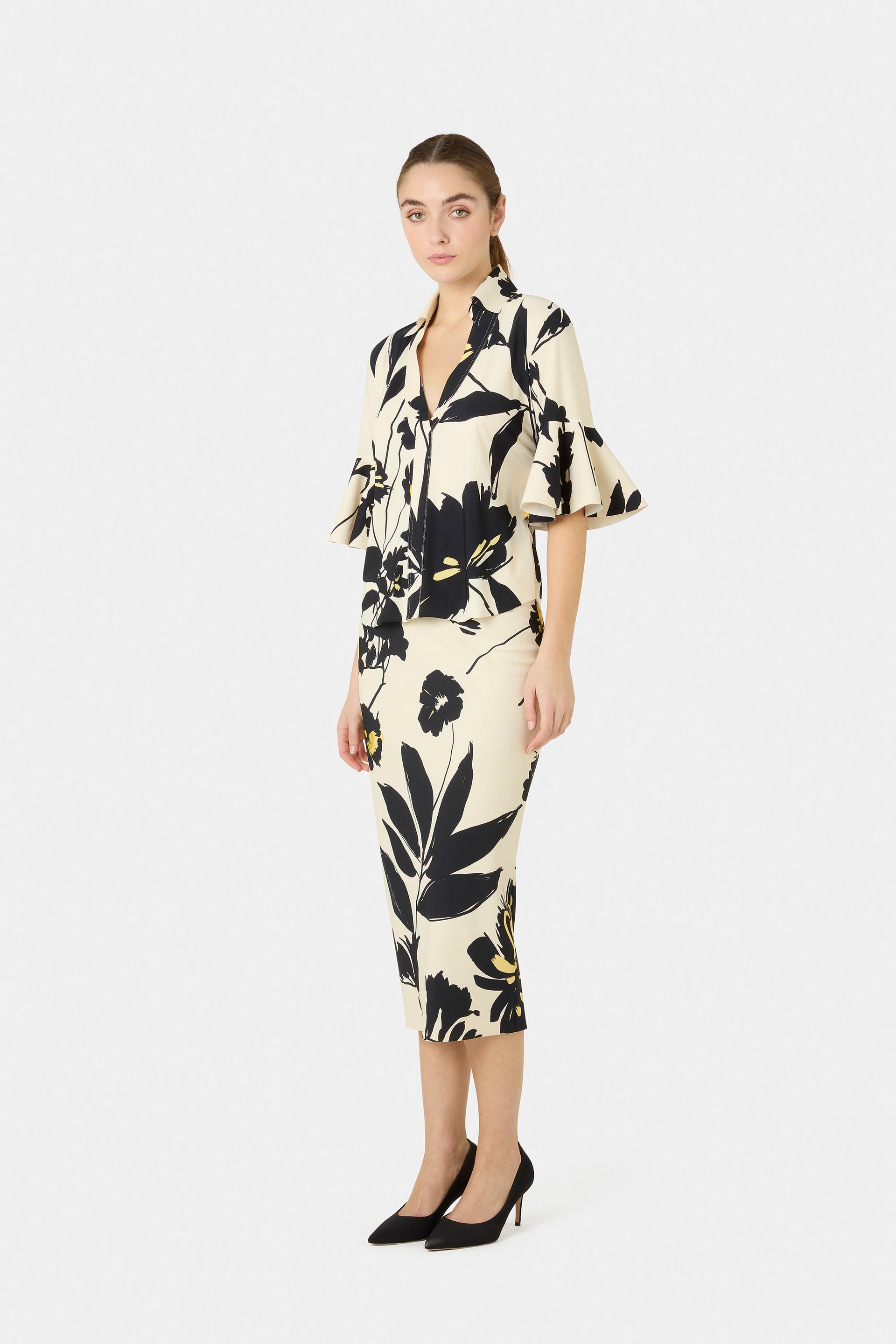 Jinza top is a fresh and summery shirt model made in a cool seasonal print. It is ideal for creating colorful full looks for both day and night.
