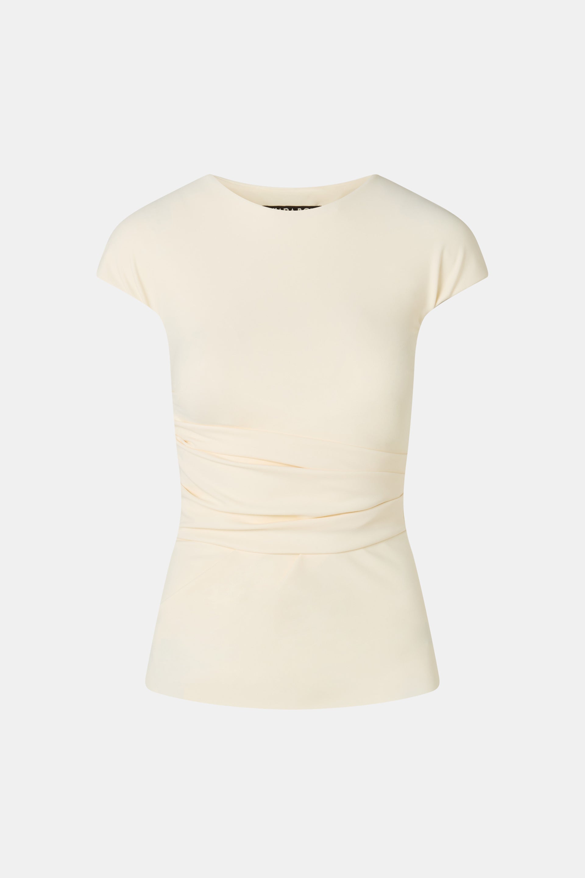 The Lisai top, crafted from lightweight jersey, features a round neckline, short sleeves, and waist detailing that creates a crossover effect. Perfect to pair with seasonal trousers or wear under a jacket. The slightly flared hem adds a refined touch to your summer looks.