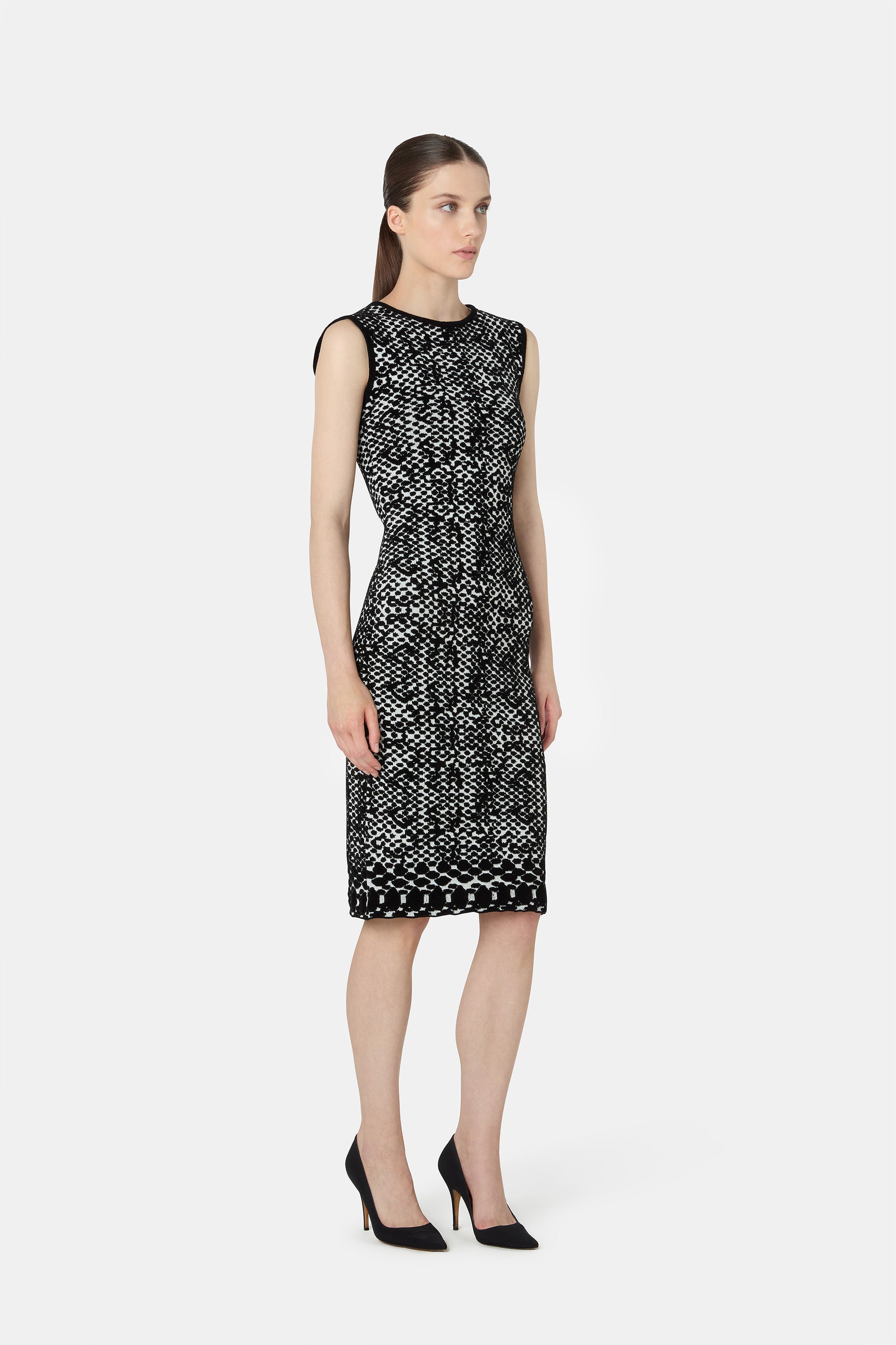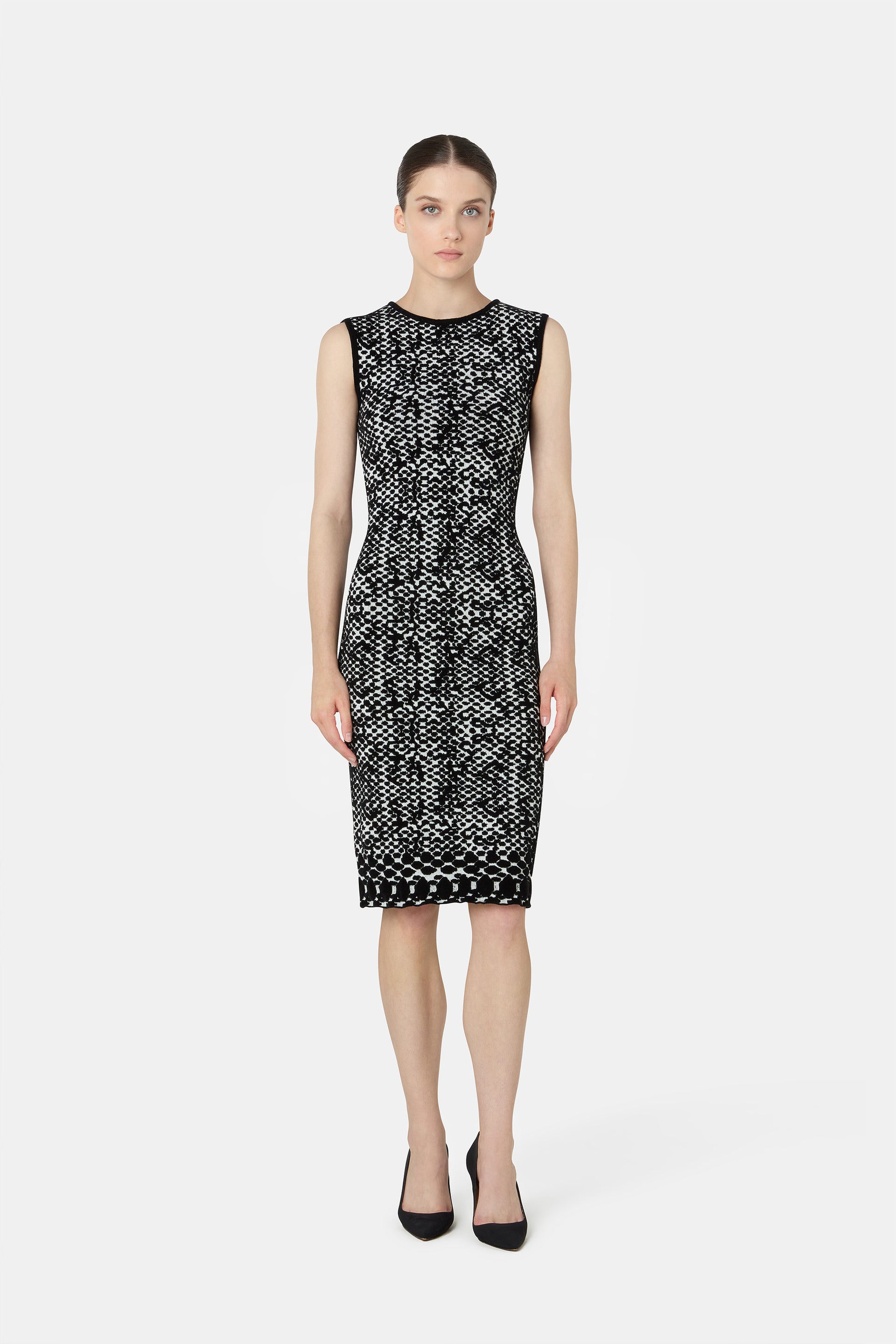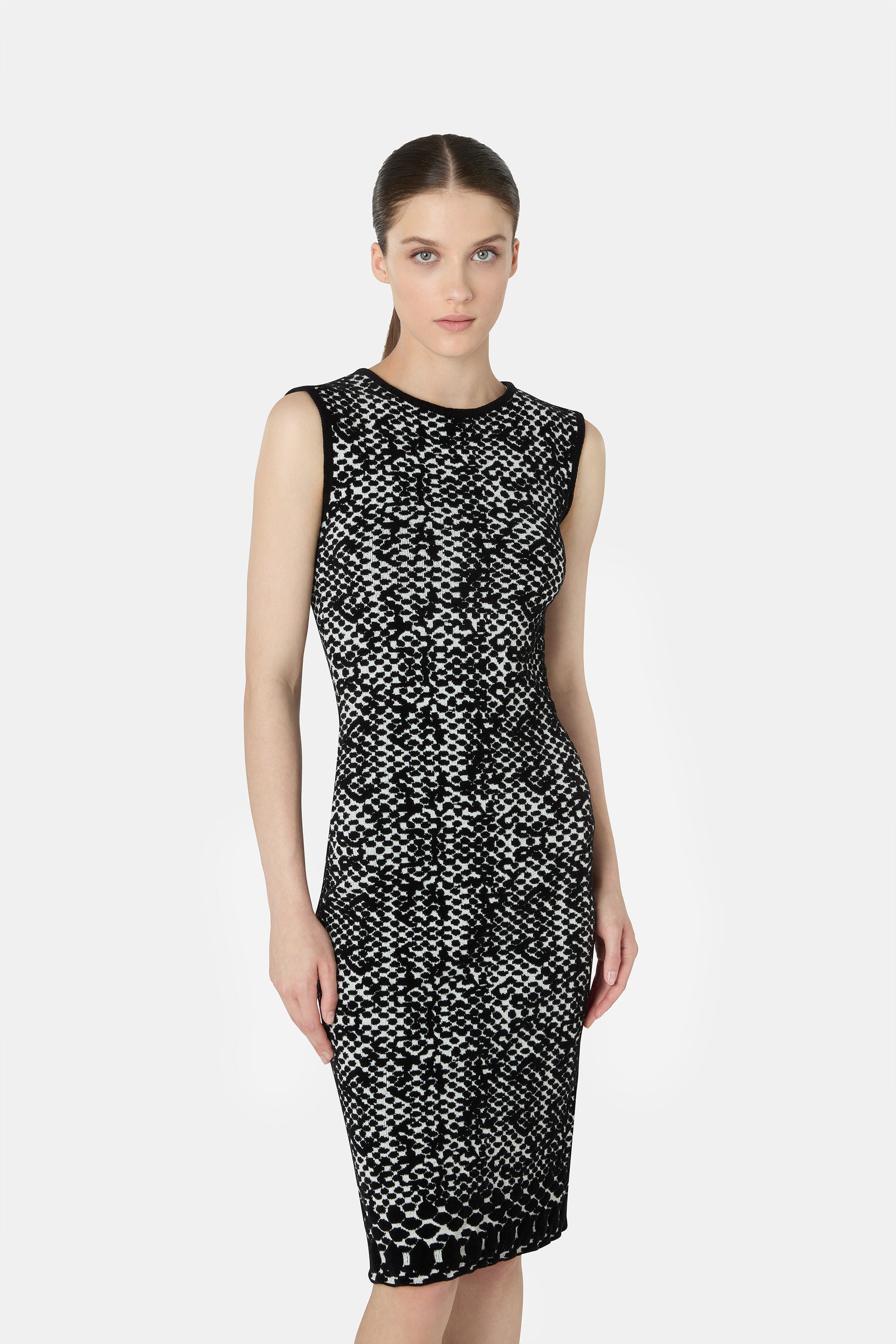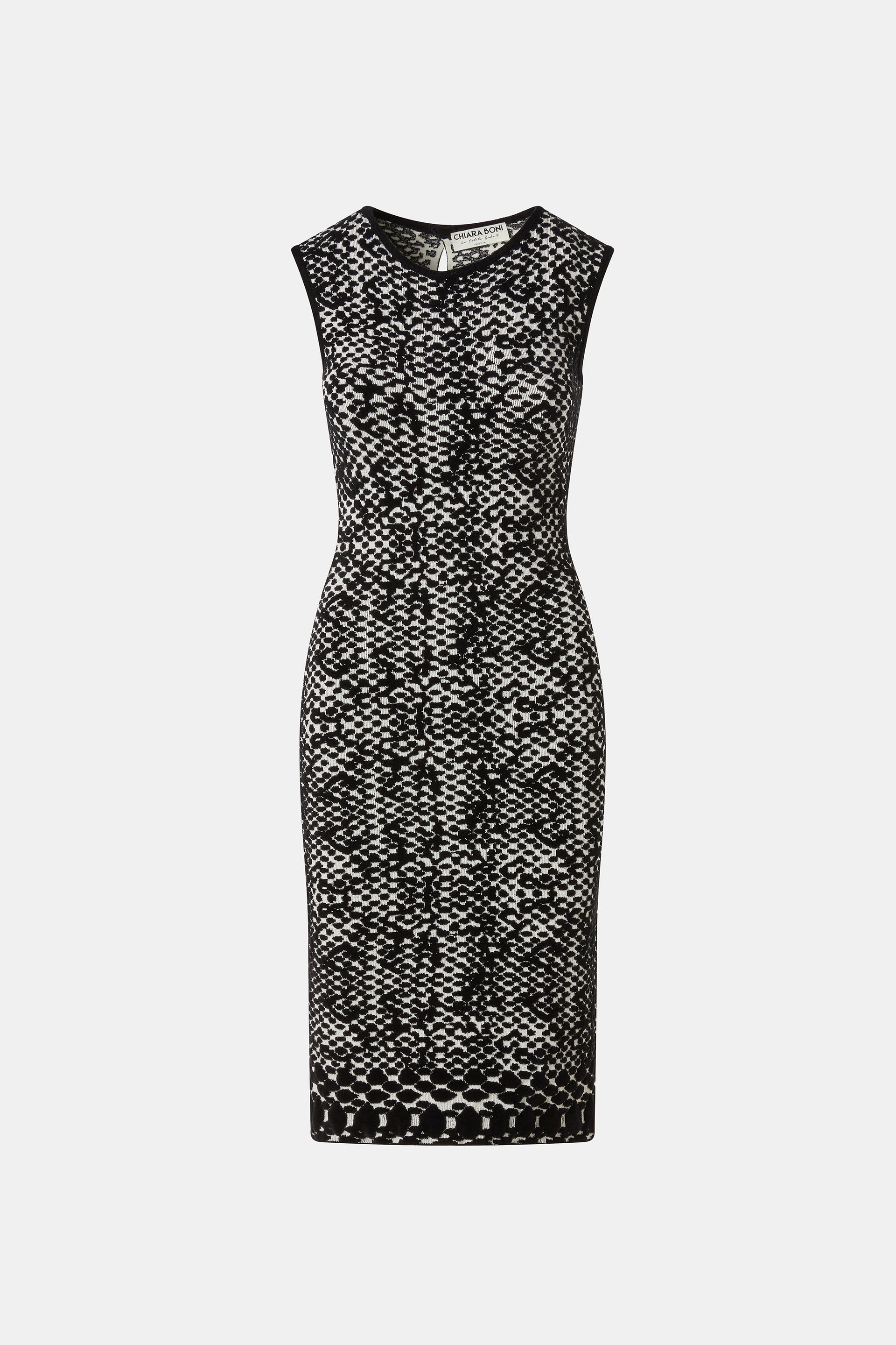A timeless classic: the Avado dress plays with the refined texture of black-and-white knitwear in an elegant graphic contrast. The sleeveless cut and form-fitting silhouette enhance the figure with sophistication, making it perfect for winter, worn on its own, paired with the matching cardigan, or layered under a tailored coat. A piece with a refined spirit, ideal for chic day-to-night occasions.