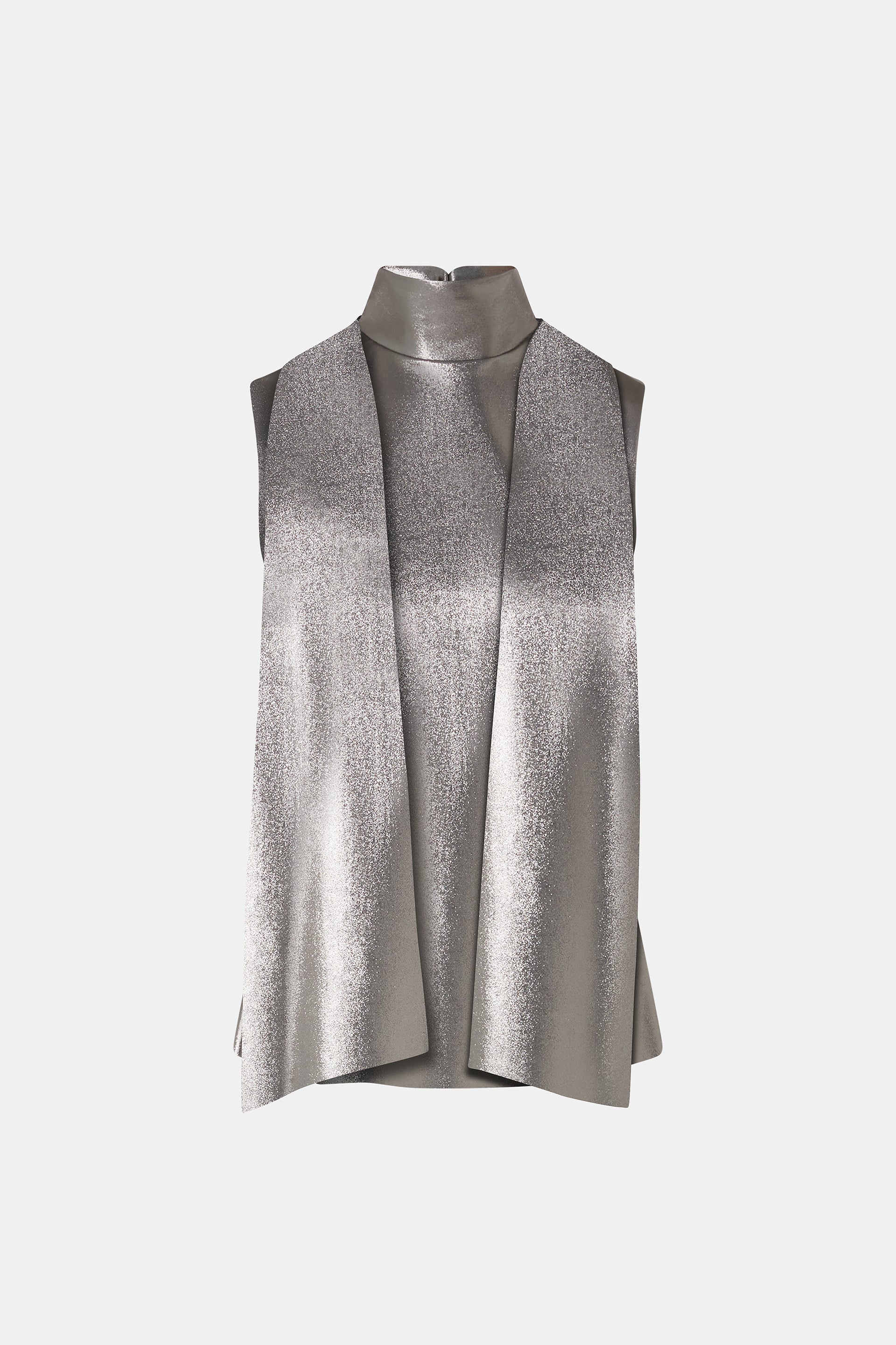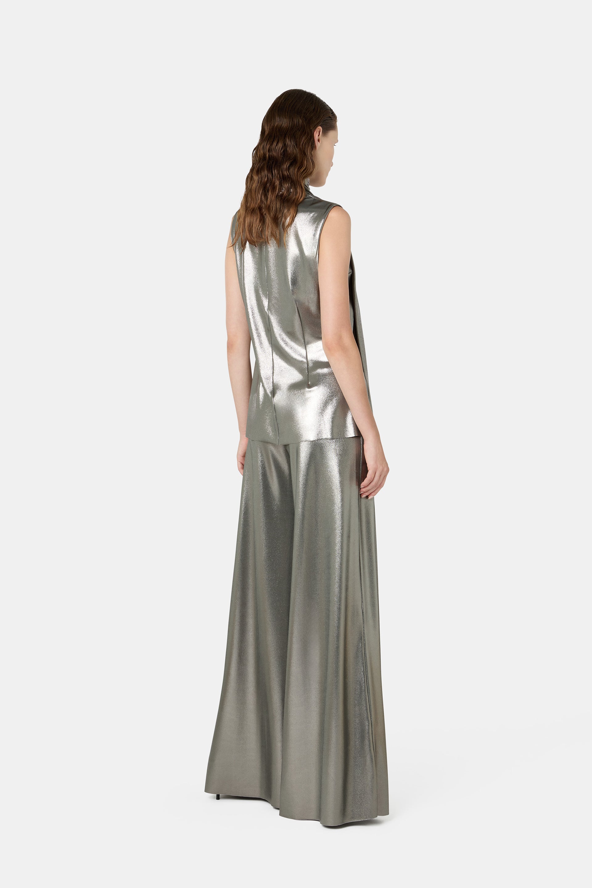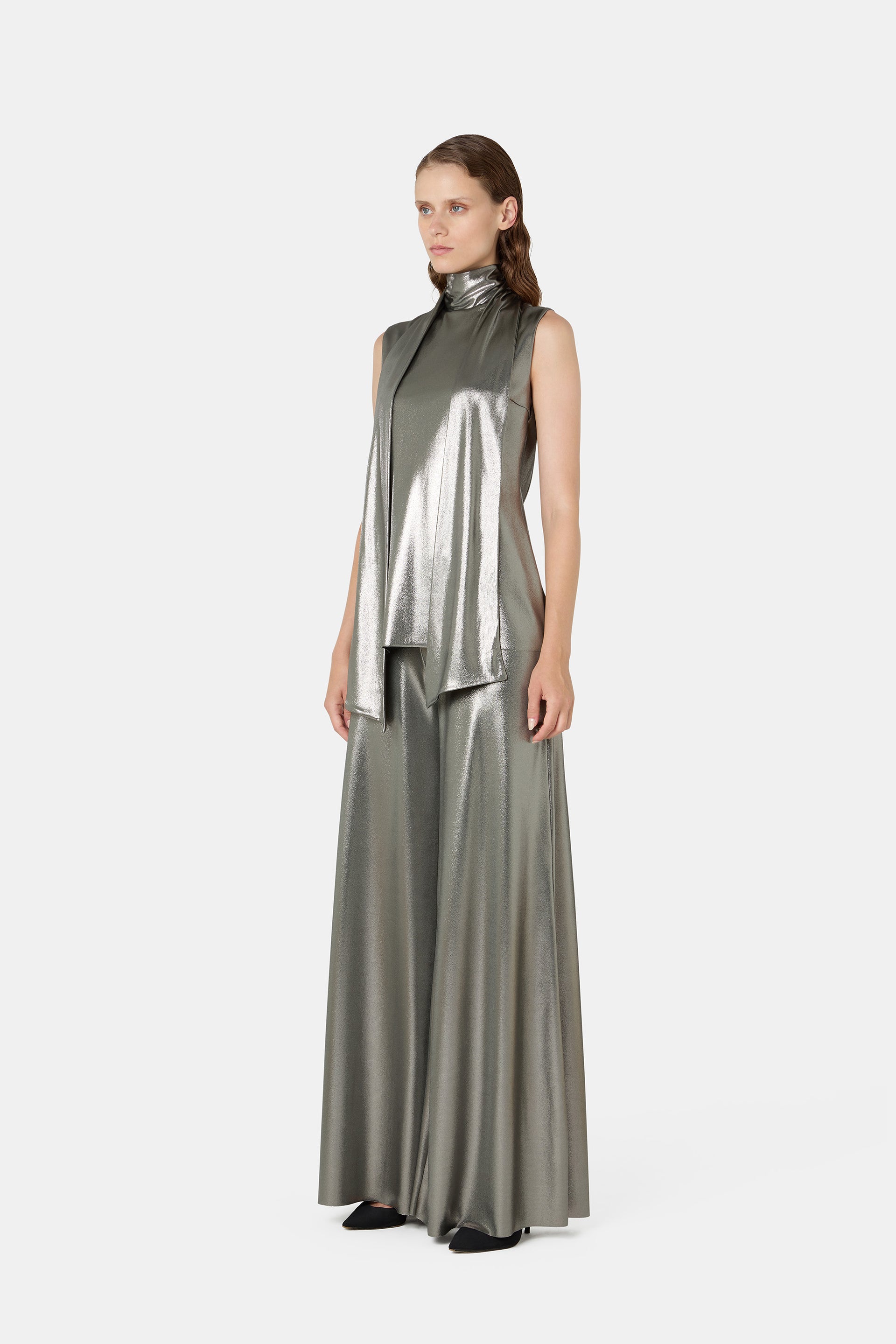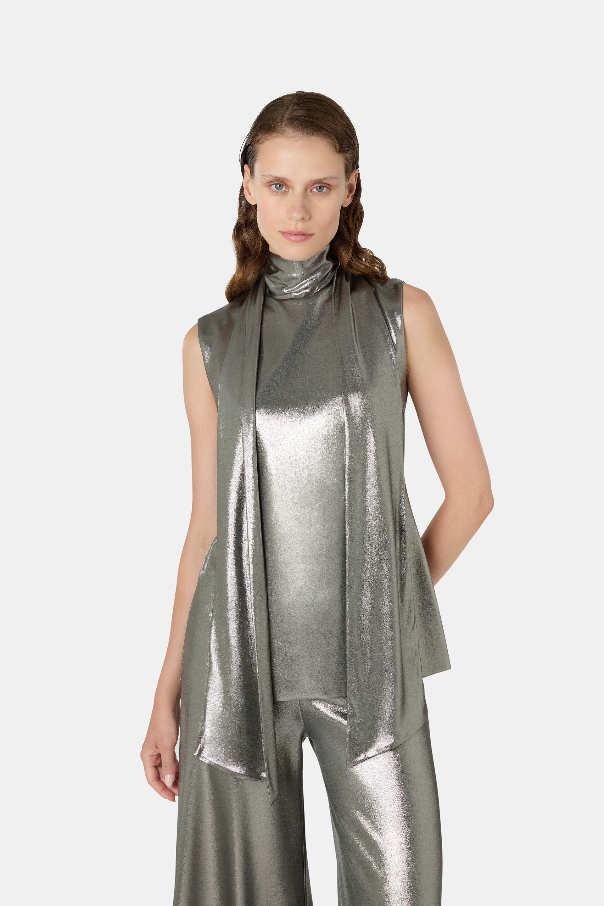 The Dila top, sleeveless and with a metallic sheen, is perfect for shining on special occasions. The scarf-style detail at the neck adds a sophisticated and stylish touch. Wear it with matching pants for a modern and glamorous look.