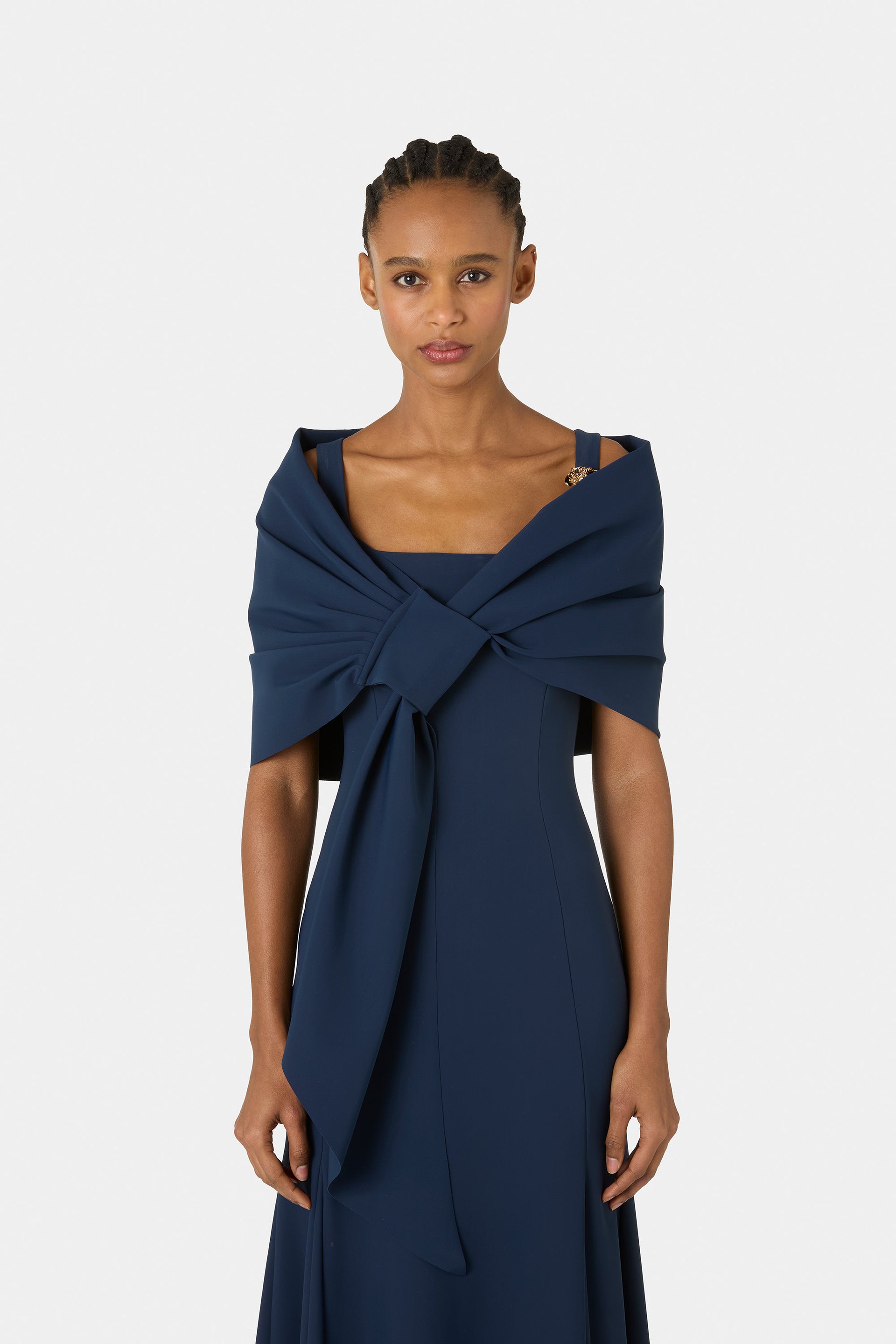 The Spring/Summer 2026 collection looks to Hollywood’s Golden Age, reinterpreting its timeless elegance with a modern and deeply feminine perspective. Essential, enveloping lines meet a palette of delicate shades, while brooches, metallic embroidery, and luminous details evoke vintage jewelry, enriching drapes and graphic silhouettes. A collection that celebrates charm, confidence, and femininity, with a cinematic yet contemporary allure.