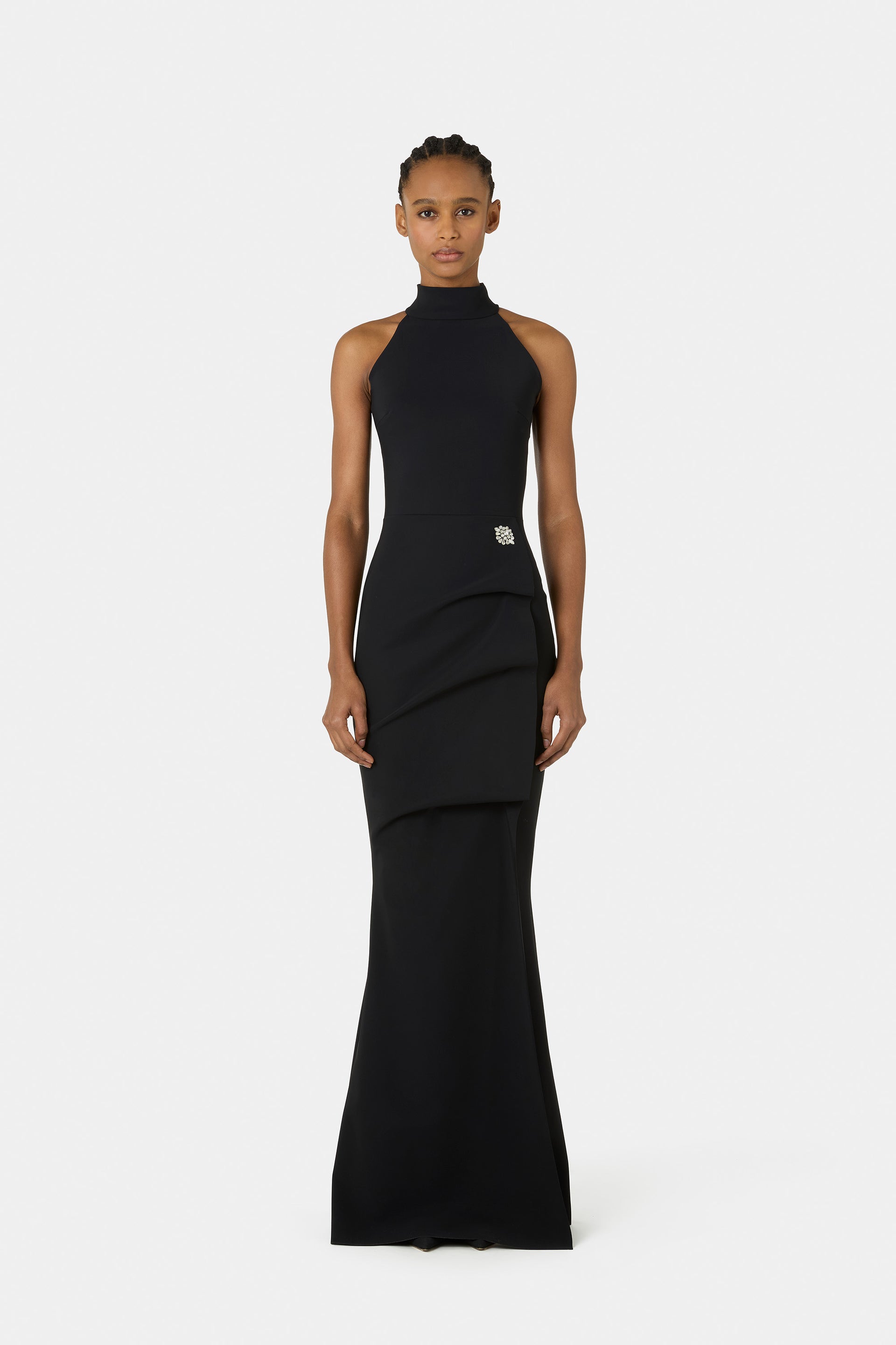 The Slavinka gown is an icon of contemporary minimalism: a total black gown with a halter neckline that interprets elegance through clean lines and an essential silhouette. Soft draping on the skirt and at the waist adds movement while subtly defining the figure. A timeless piece where style meets modernity.