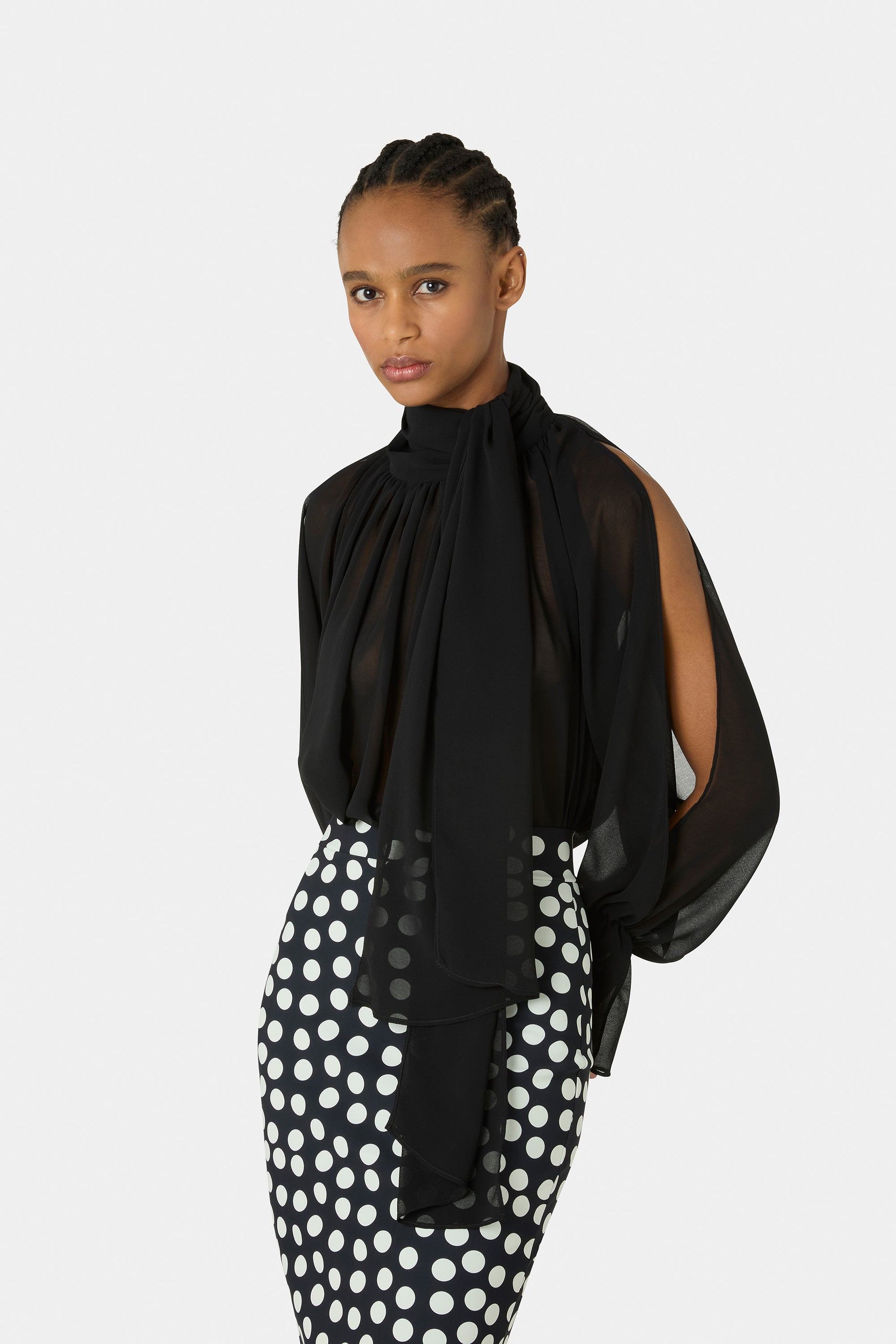 The Slawa shirt is an elegant and versatile piece, perfect for completing sophisticated looks or adding a refined touch to everyday outfits. Crafted from a lightweight, semi-sheer fabric, it exudes contemporary, understated femininity. Ideal with tailored trousers or skirts, it effortlessly transitions from office hours to evening occasions.