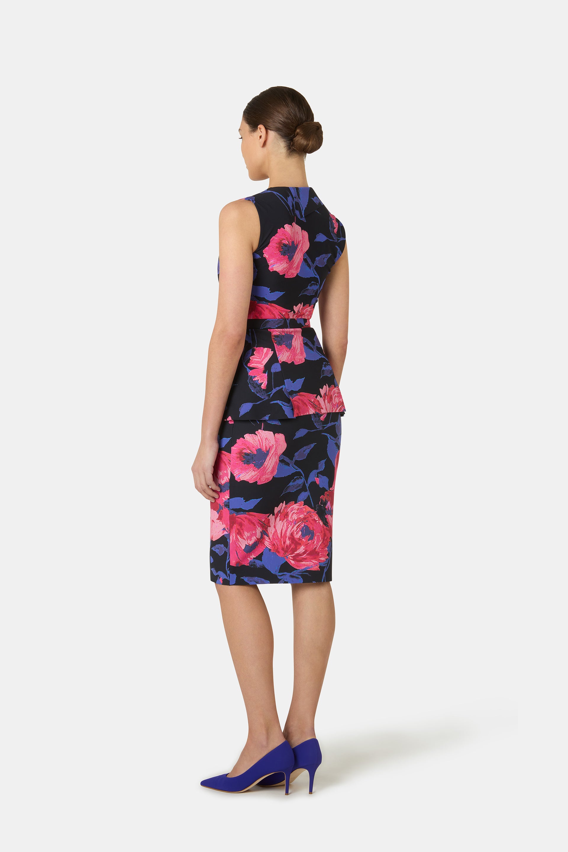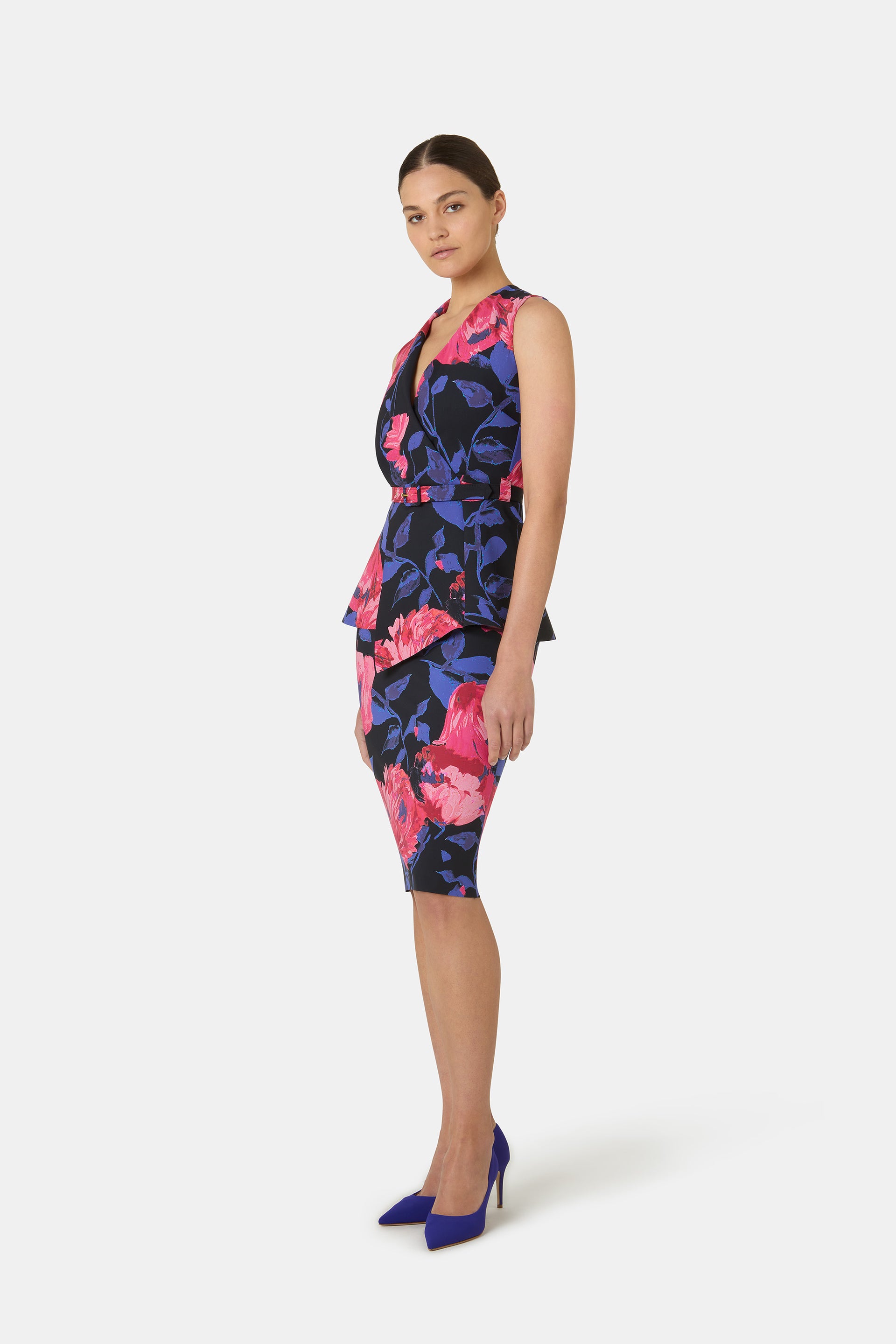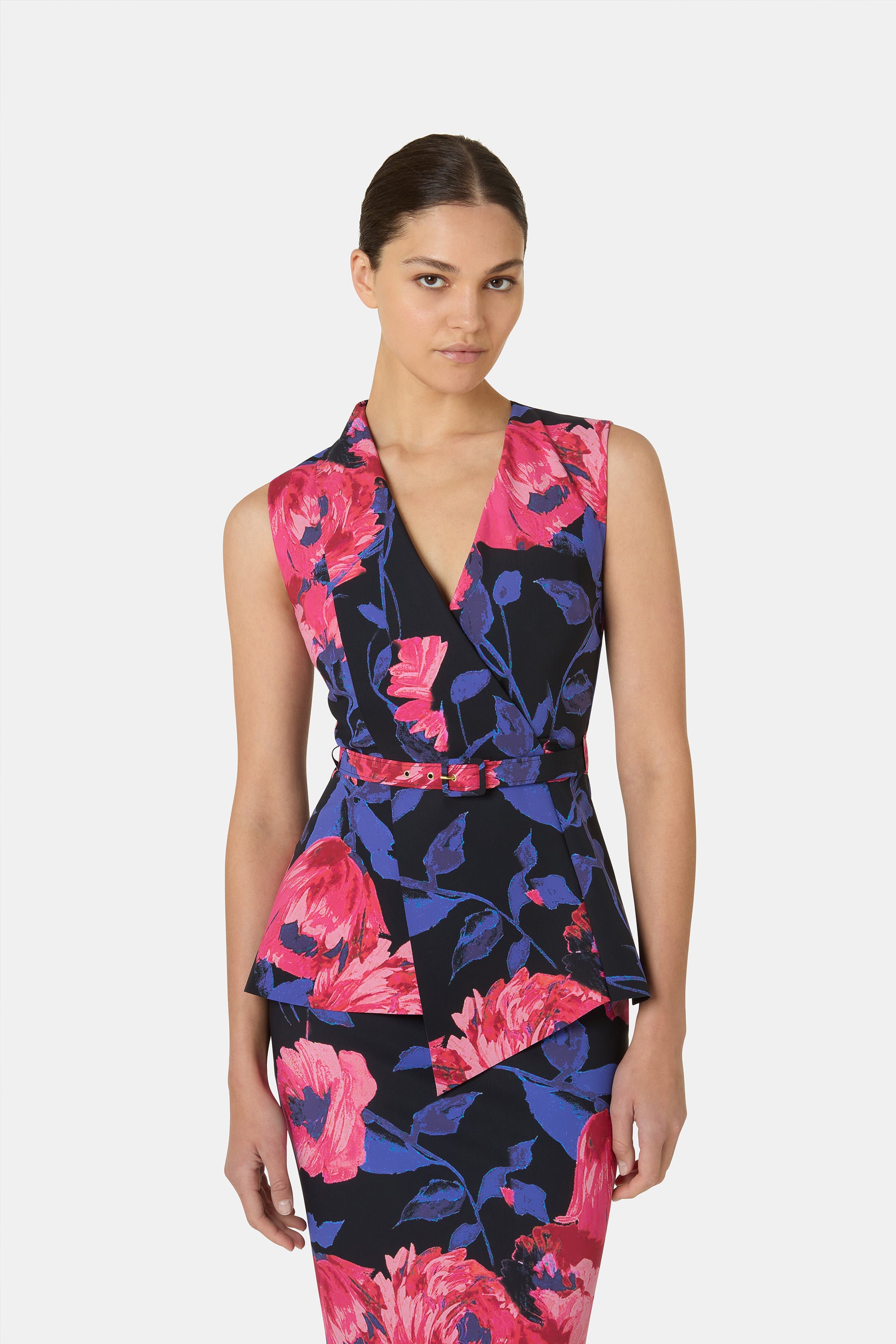 Il top Giug, realizzato in una sofisticata stampa di stagione, è caratterizzato da uno scollo V, una cintura regolabile in vita e un orlo asimmetrico che donano originalità e movimento al capo. Ideale da indossare sulla gonna a tubino in coordinato per un full look allinsegna dello stile.