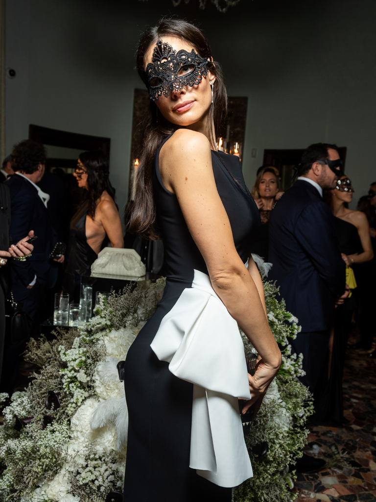Il look, fresco e raffinato, unisce eleganza senza tempo e dettagli super-chic, con il fiocco a contrasto che aggiunge un tocco di drammaticità sofisticata al design moderno dell’abito.
