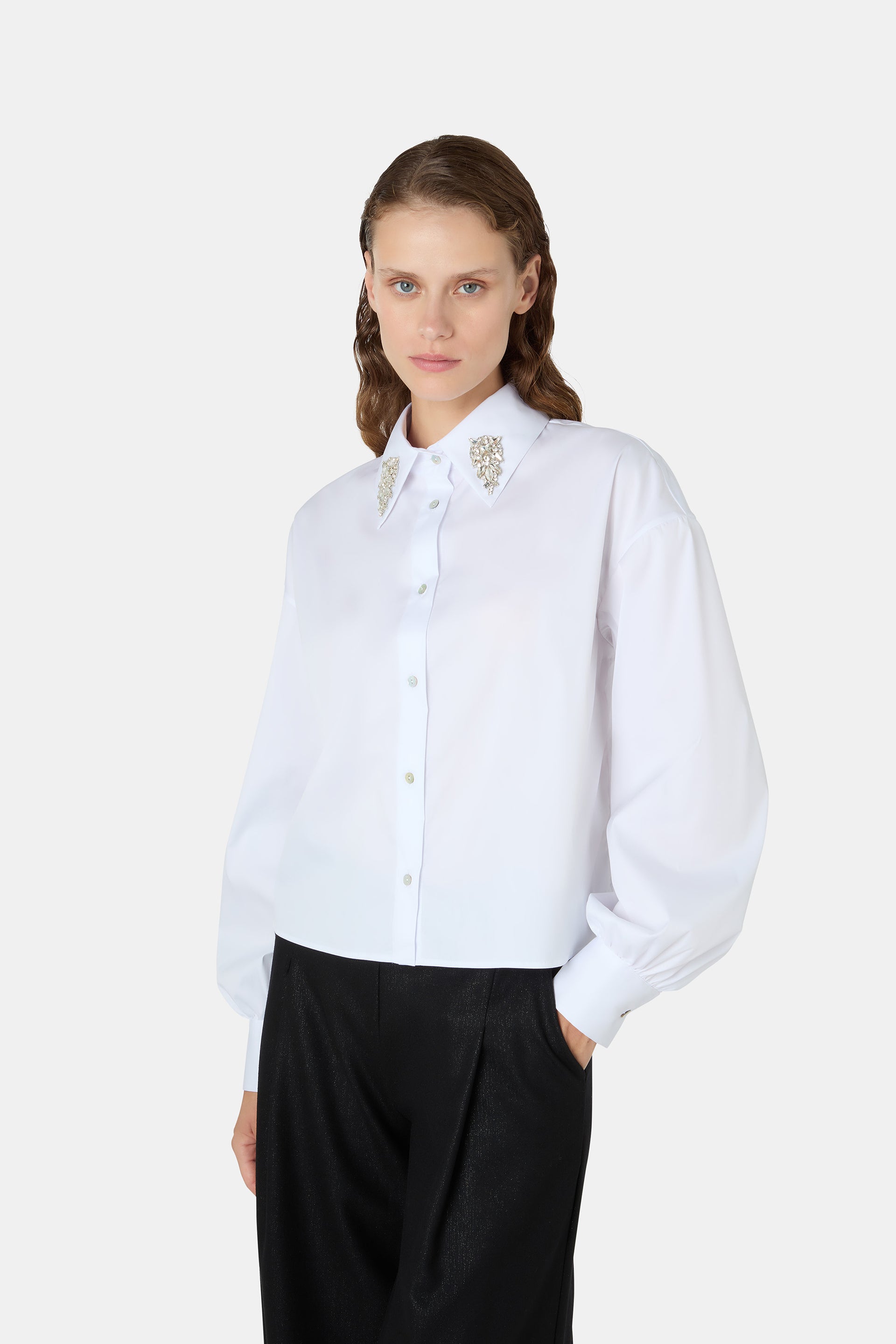 La camicia bianca in cotone, icona di stile, si reinventa con un twist gioiello. Il colletto illuminato da dettagli preziosi dona carattere a una silhouette minimal ma decisiva. Indossa la camicia Pefil sotto un tailleur CHIARA BONI per un look iper raffinato.