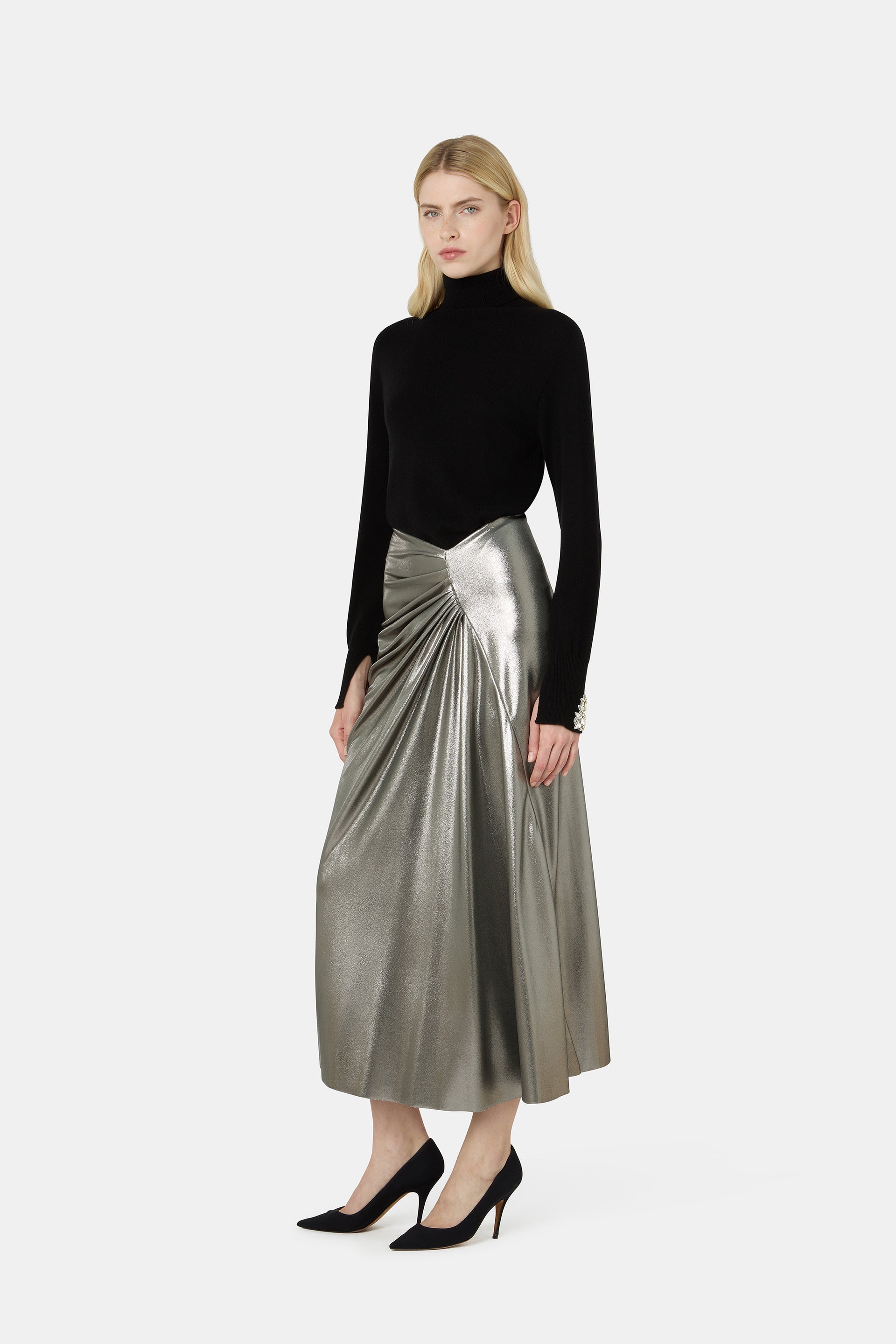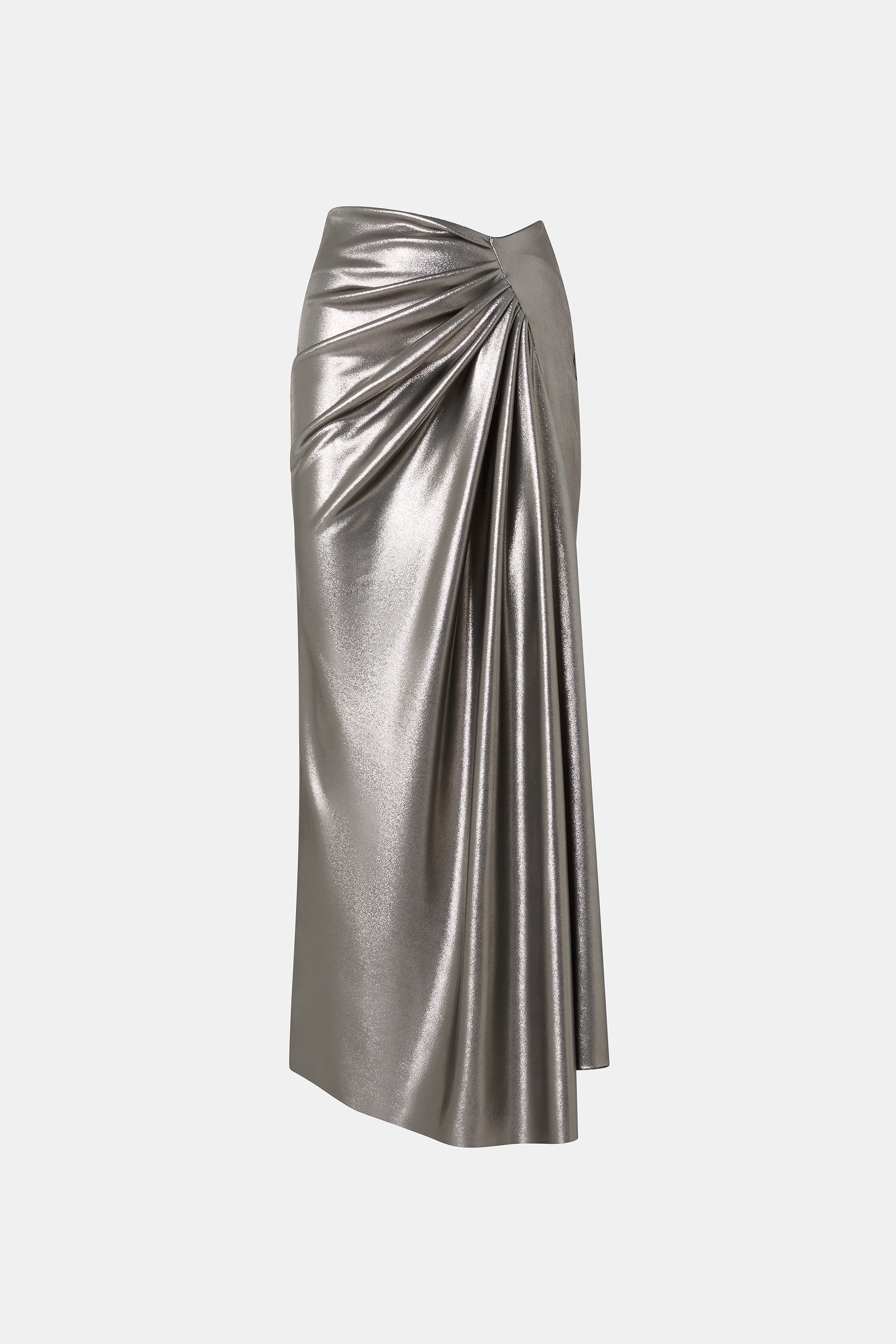 La gonna Mirah in tessuto splendid cattura lo sguardo con drappeggi scultorei che disegnano la silhouette con eleganza. La lucentezza del tessuto esalta ogni movimento, per un look che fonde modernità e femminilità sofisticata. Perfetta per le occasioni più glamour.
