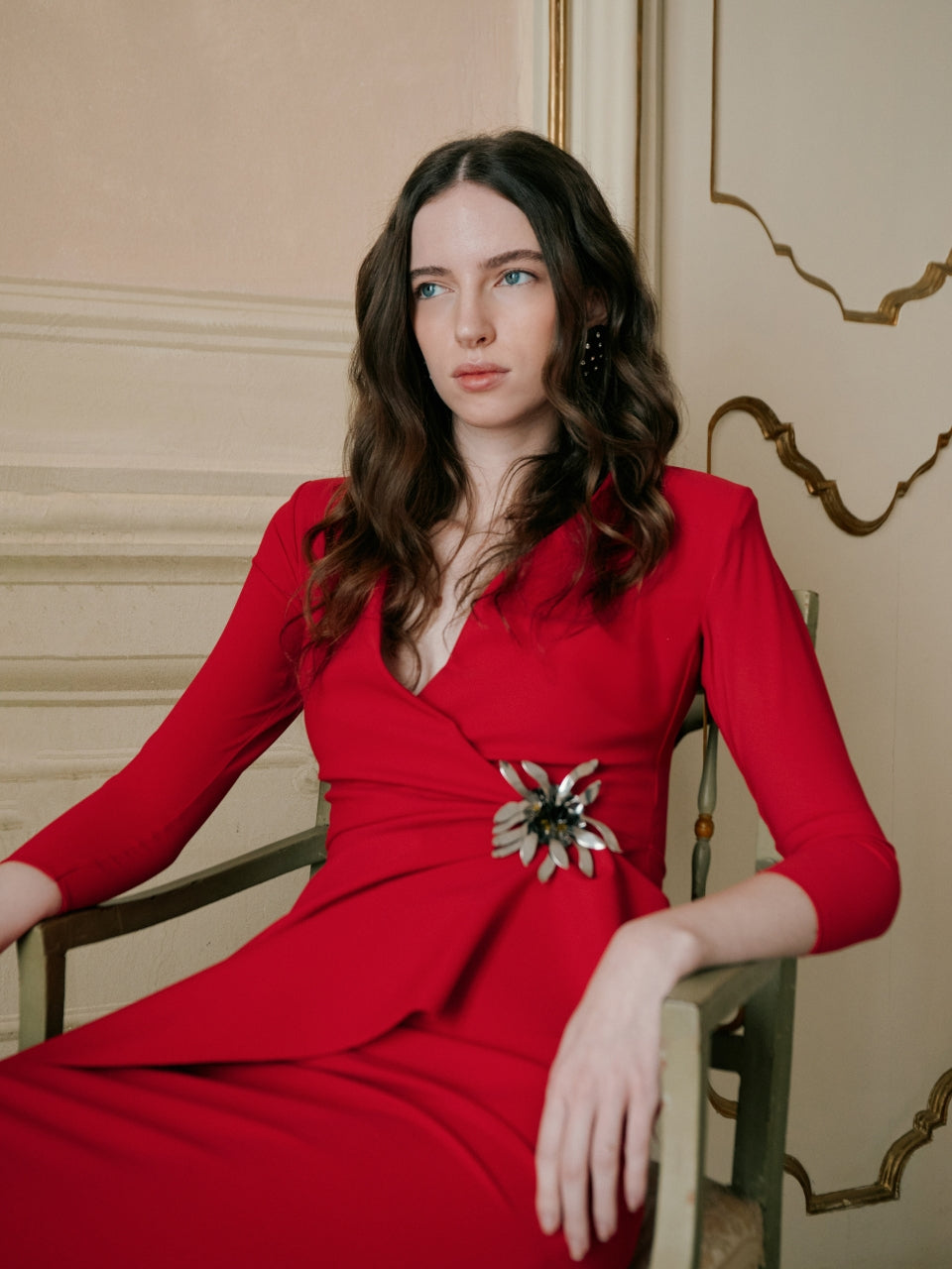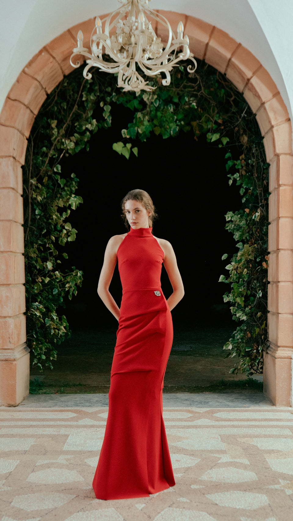 La collezione Primavera/Estate 2026 guarda alla Golden Age di Hollywood reinterpretandone l’eleganza senza tempo con uno sguardo moderno e profondamente femminile. Linee essenziali e avvolgenti incontrano una palette di tonalità delicate, spille, ricami metallici e dettagli luminosi richiamano gioielli d’epoca, impreziosendo drappeggi e silhouette grafiche. Una collezione che celebra fascino, sicurezza e femminilità , con un’allure cinematografica e contemporanea.