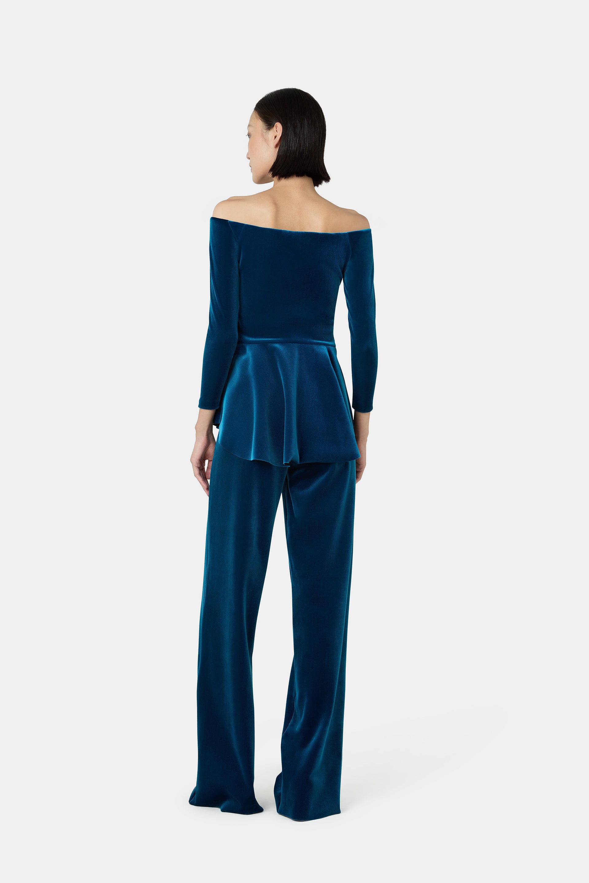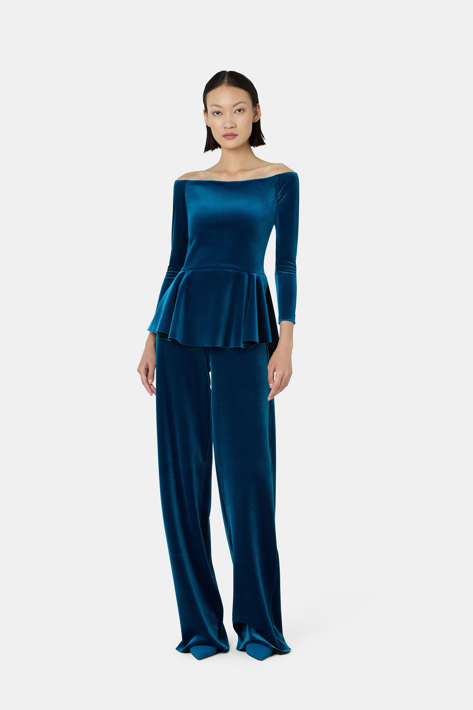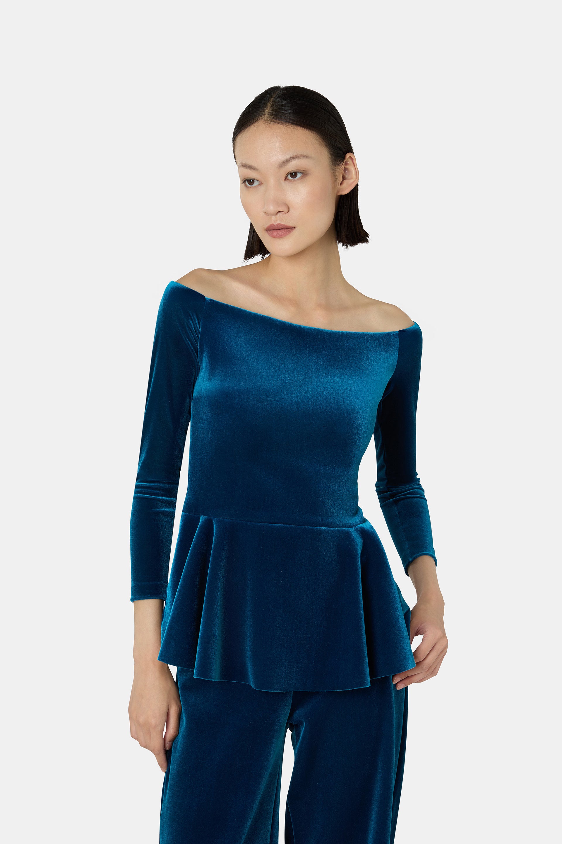 Un top in pieno stile CHIARA BONI. Il top Tuba in velluto è un modello con scollo a barca che lascia le spalle scoperte e baschina in vita. Ideale da abbinare a gonne e pantaloni di collezione.