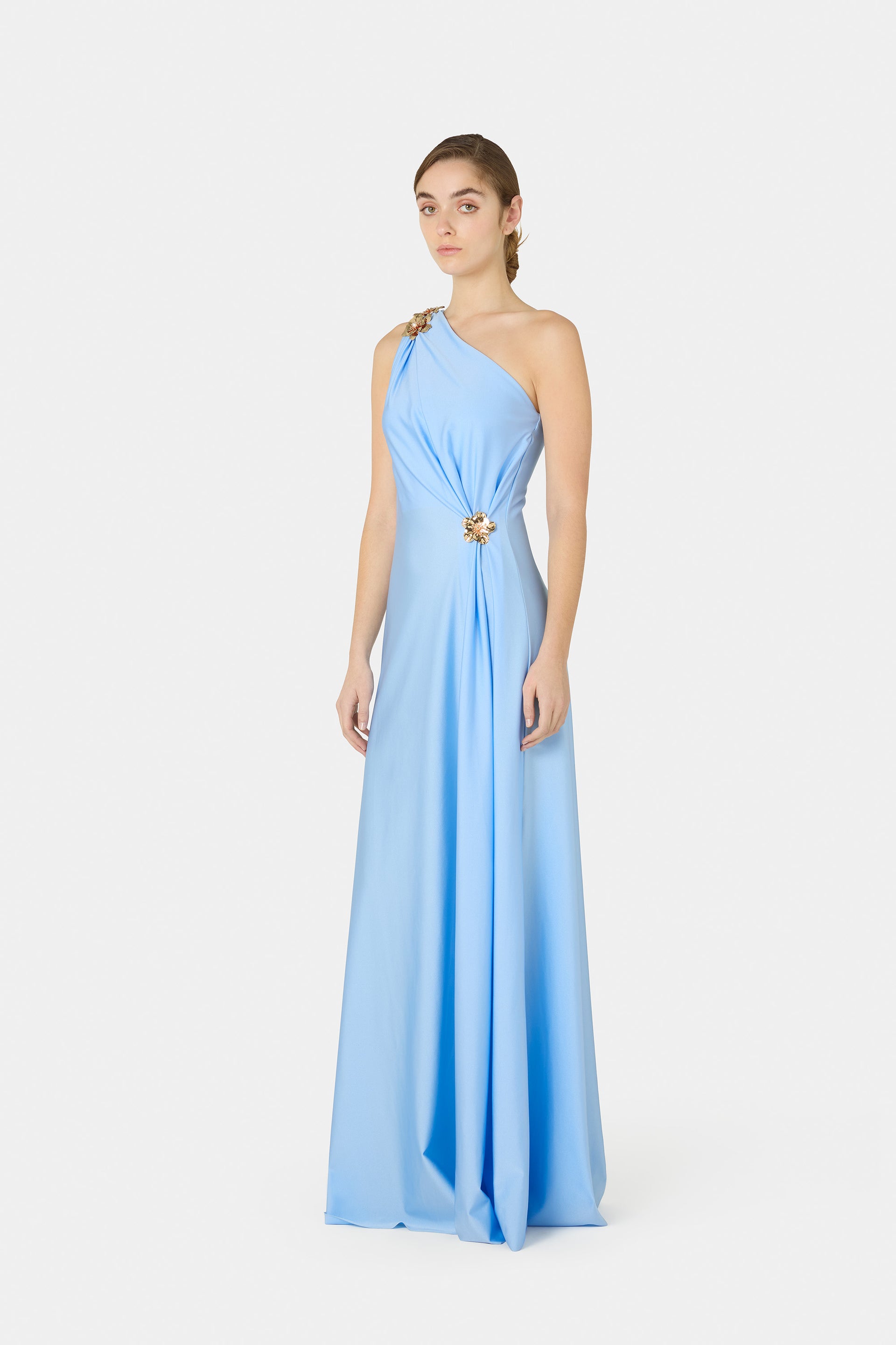 Inspired by the timeless elegance of Greek style, the Goska JJ dress softly embraces the silhouette with an ethereal feel. Fluid draping shapes the body with natural harmony, while jeweled flower pins illuminate the design. A piece of pure elegance, created for those who desire a refined, feminine, and truly unforgettable allure.