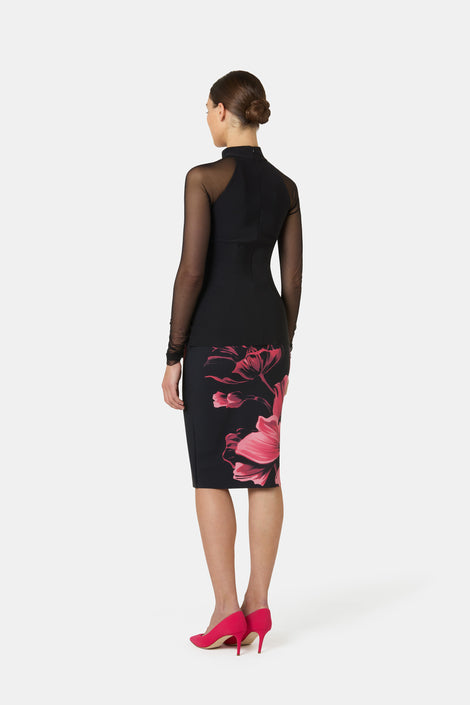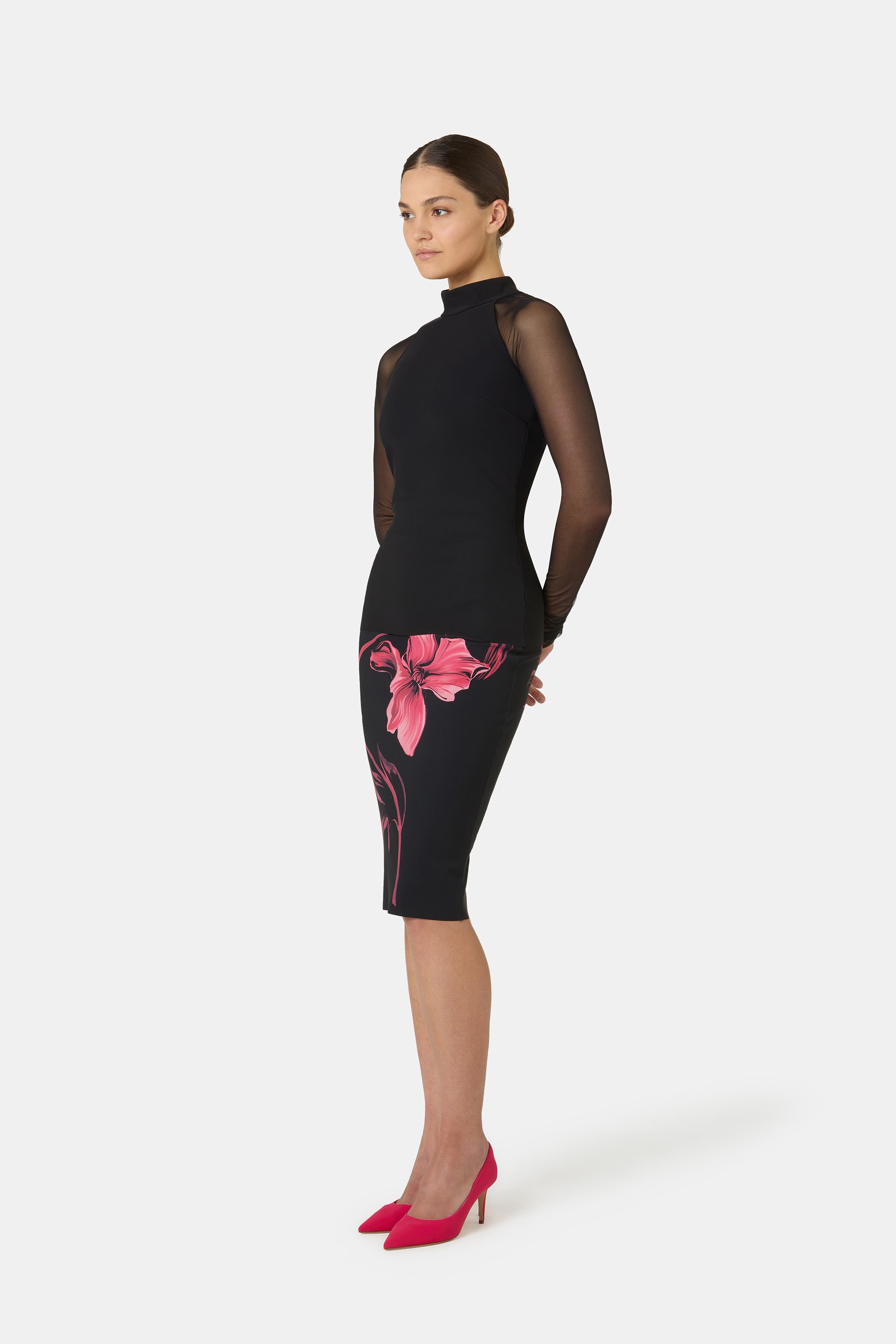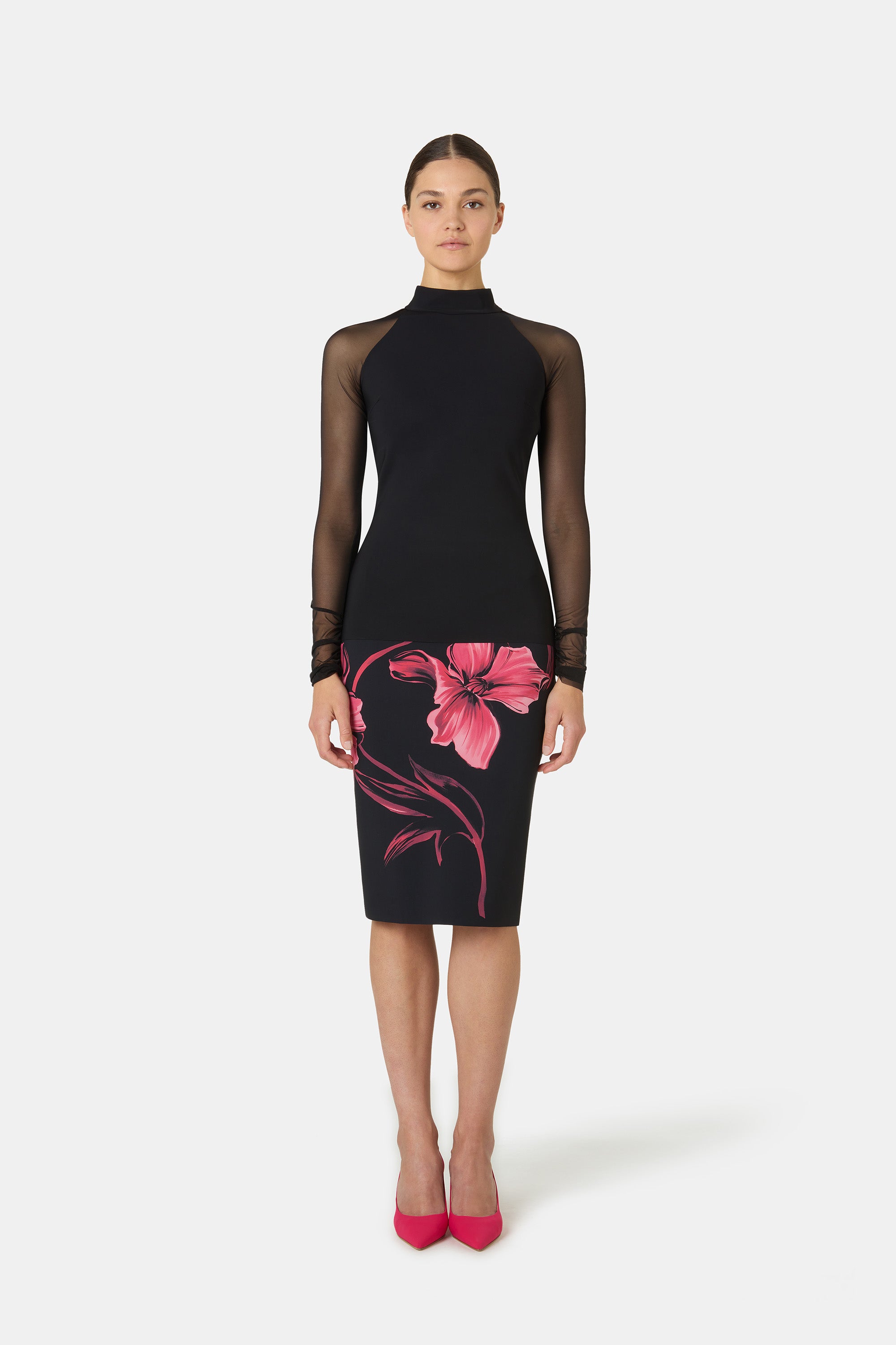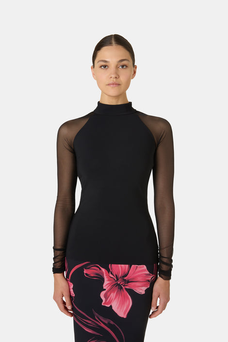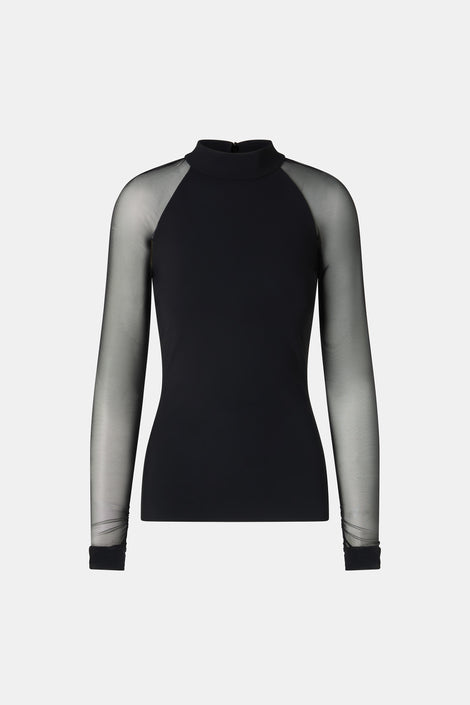 The slim-fit Islu top features a stretch jersey body paired with elegant long sleeves in tulle. it is perfect for wearing under a jacket or pairing with the pants and skirts from the collection.