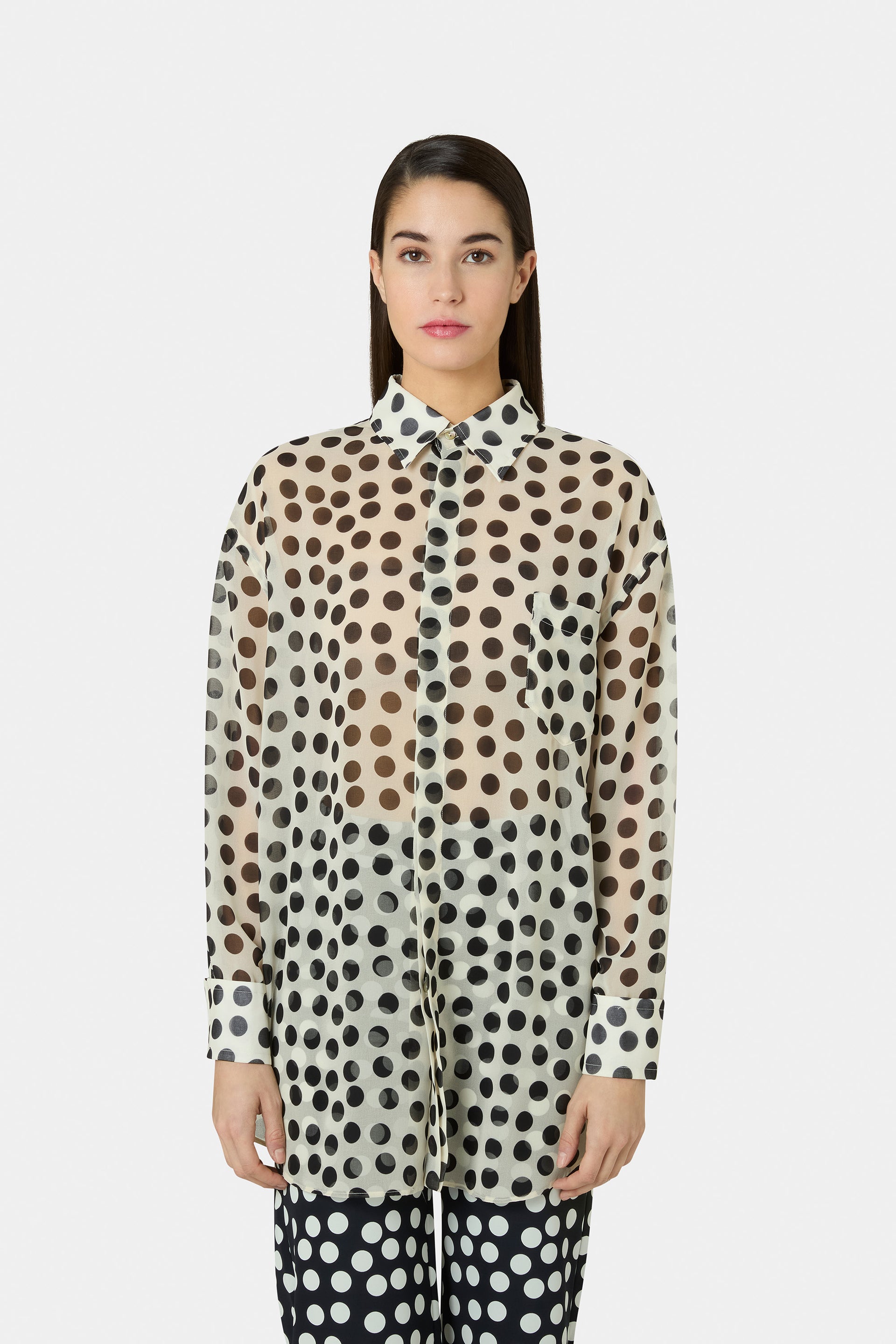 The Jolka polka-dot shirt effortlessly blends comfort and style. A chest pocket adds a distinctive detail, while the oversized cut ensures fluid movement. Perfect paired with printed trousers for a coordinated total look, or with monochrome tones for a sleek, sophisticated contrast, this versatile piece is irresistibly chic.