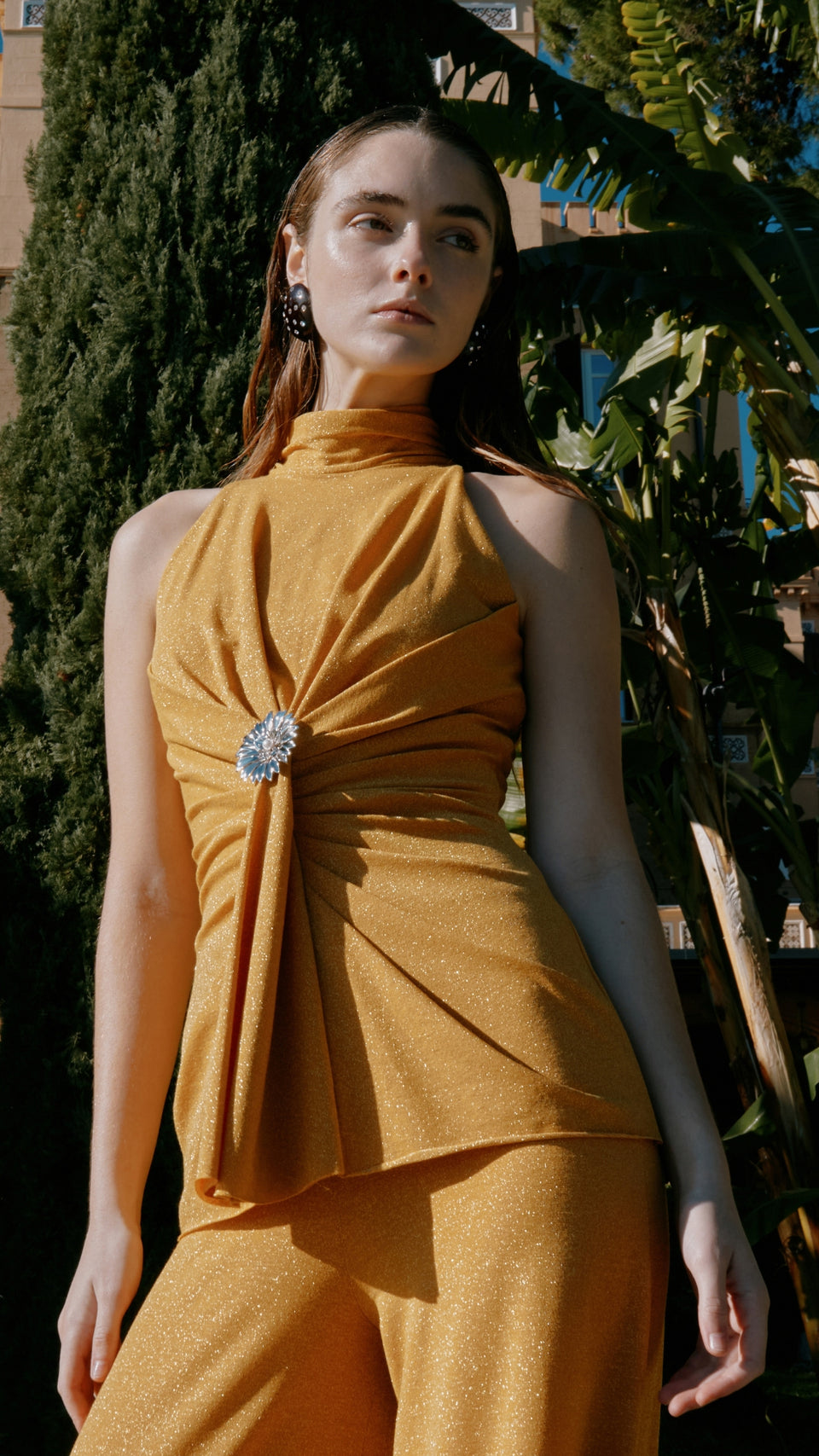 The Spring/Summer 2026 collection looks to Hollywood’s Golden Age, reinterpreting its timeless elegance with a modern and deeply feminine perspective. Essential, enveloping lines meet a palette of delicate shades, while brooches, metallic embroidery, and luminous details evoke vintage jewelry, enriching drapes and graphic silhouettes. A collection that celebrates charm, confidence, and femininity, with a cinematic yet contemporary allure.