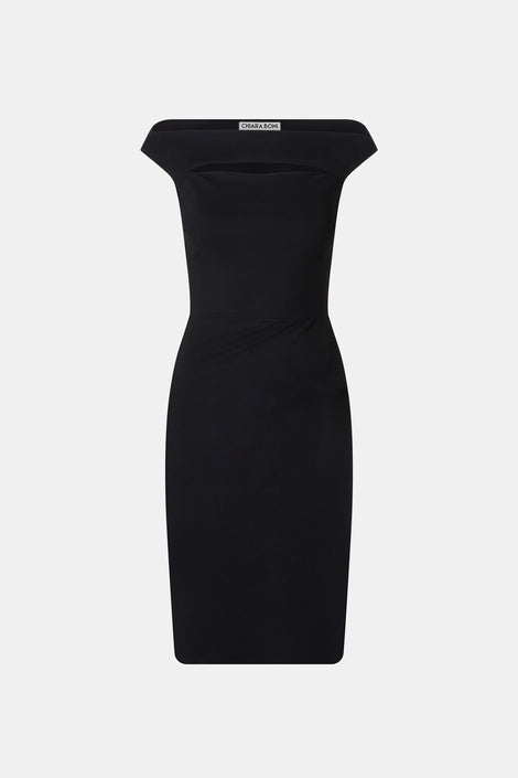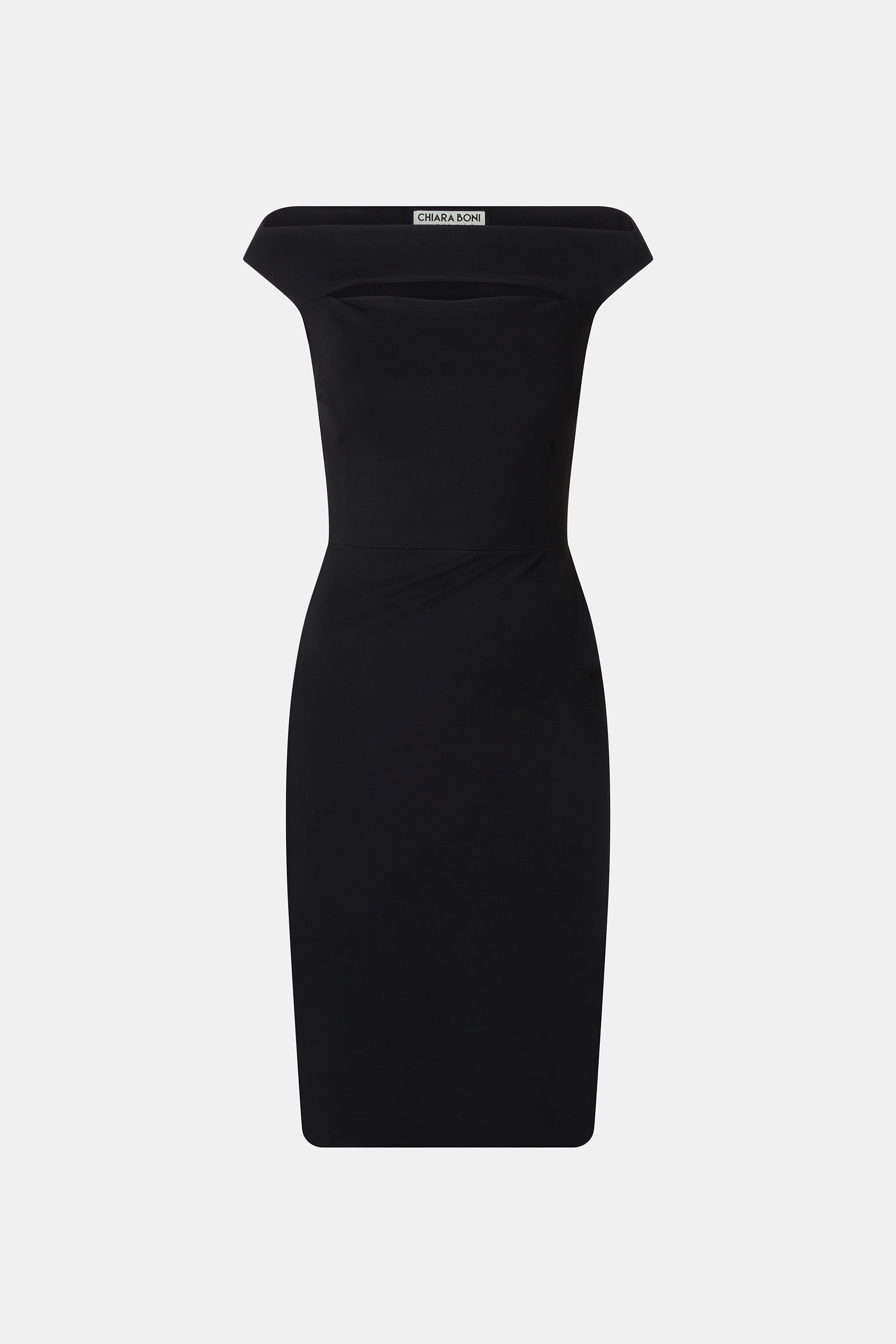 A Chiara Boni classic. The Melania dress is instantly recognizable, with a distinctive straight neckline with a horizontal cut-out across the décolleté, and elegantly draped skirt. A versatile dress suited for any occasion, day or night.