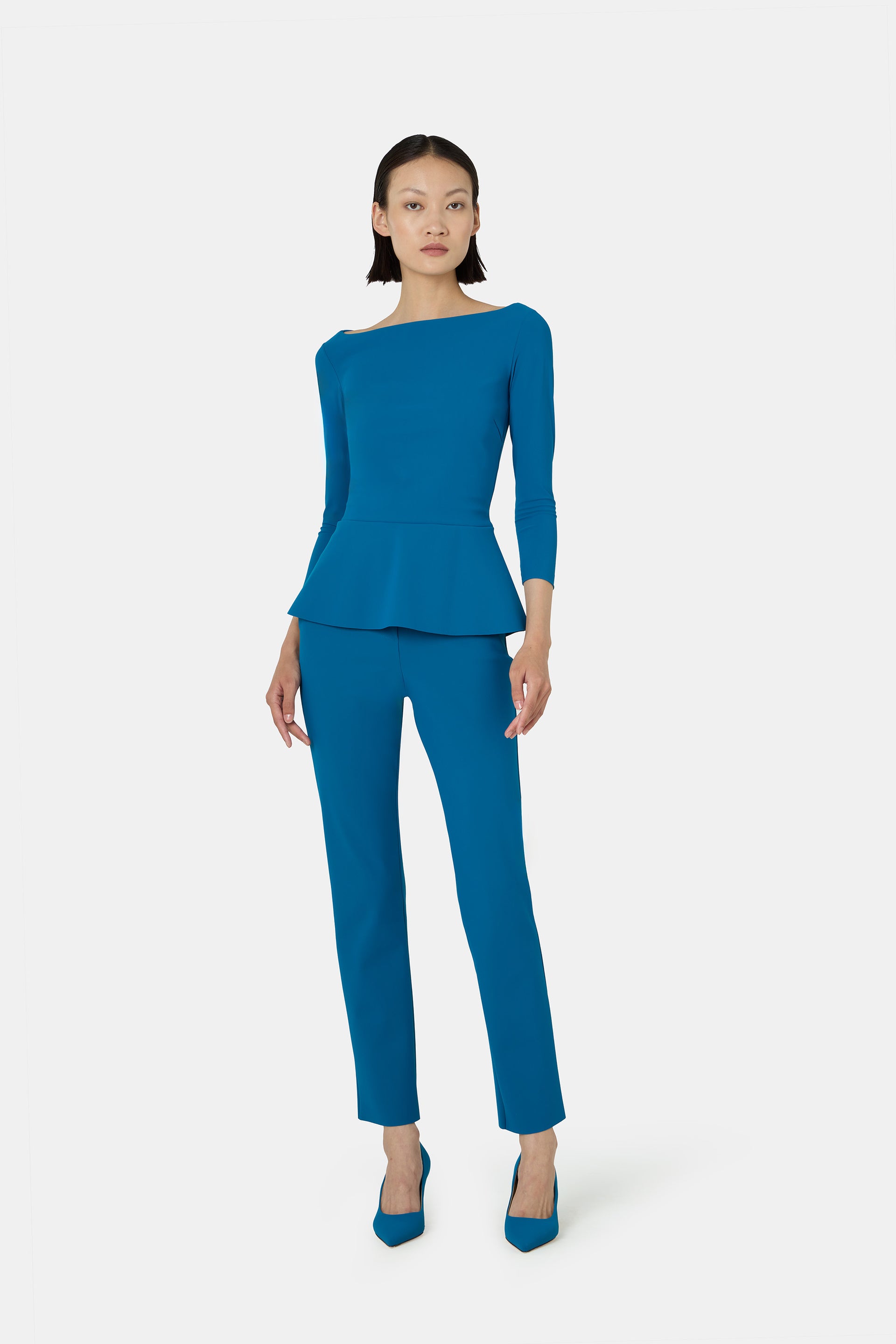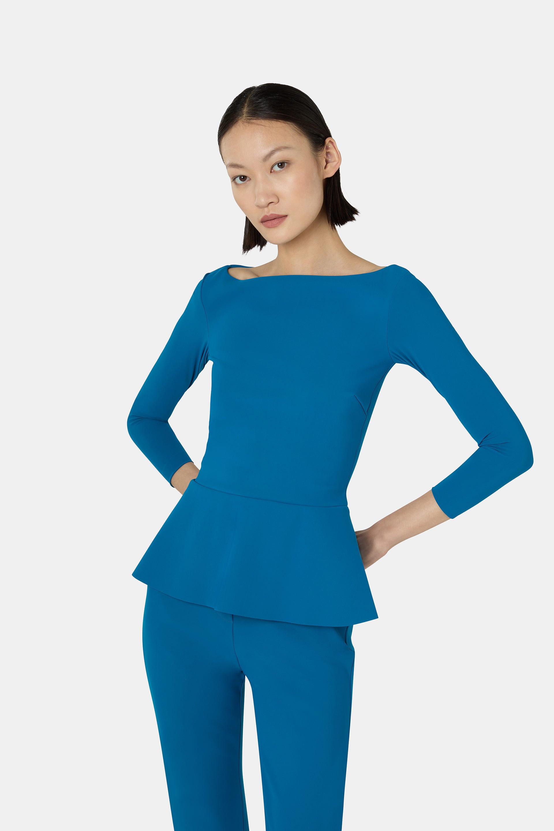 Essential lines and innate charm define the Niky top, with long sleeves and a boat neckline in the sophisticated Teal Blue hue. A timeless elegance that gently embraces the silhouette with effortless refinement. Pair it with the matching skirt for an even more elevated look.