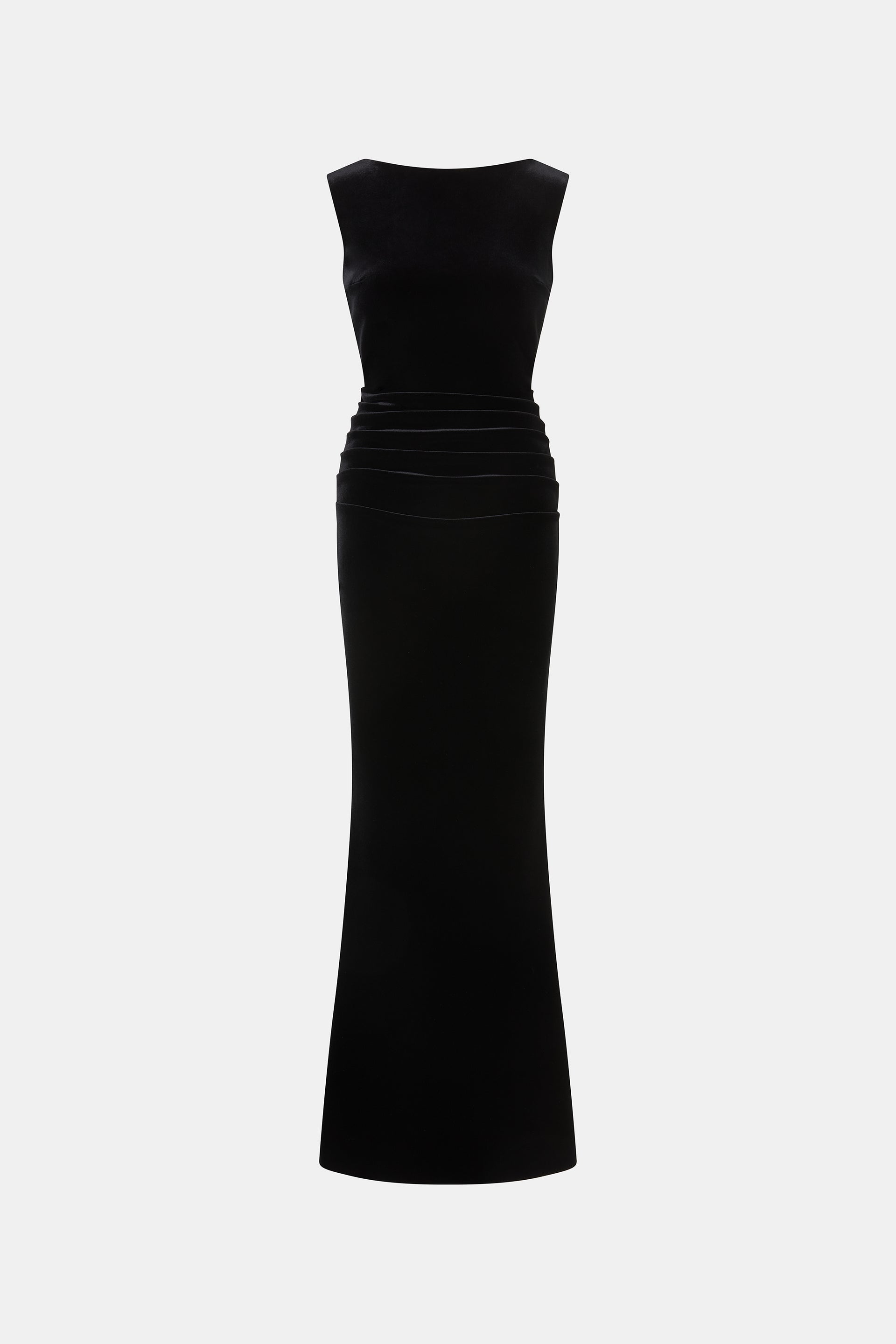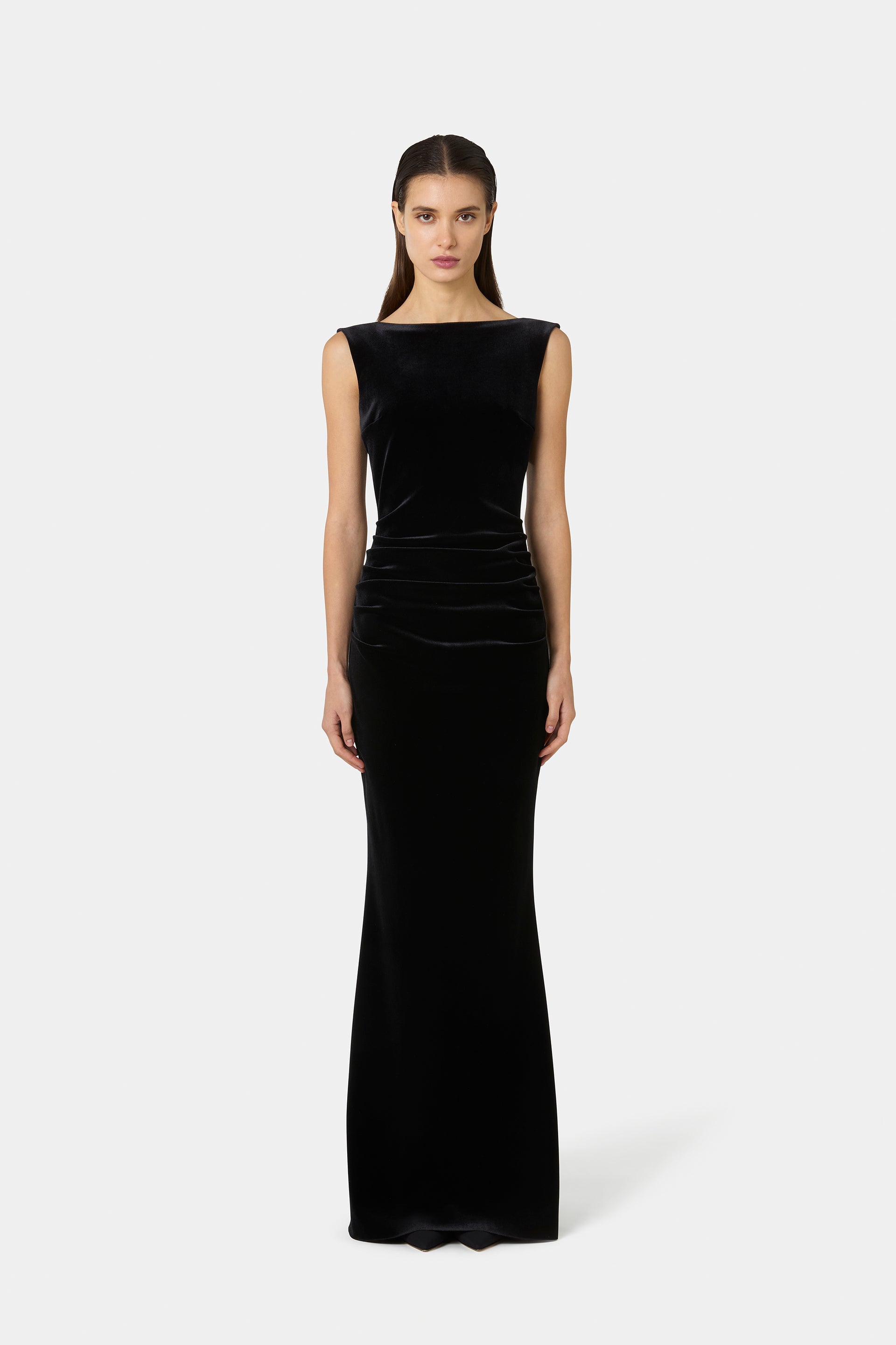 A sophisticated, modern, and undeniably glamorous line. The Nima gown in black velvet is a contemporary style icon. Elegant waist draping and a V-back neckline adorned with a jeweled detail enhance the figure with refined elegance.