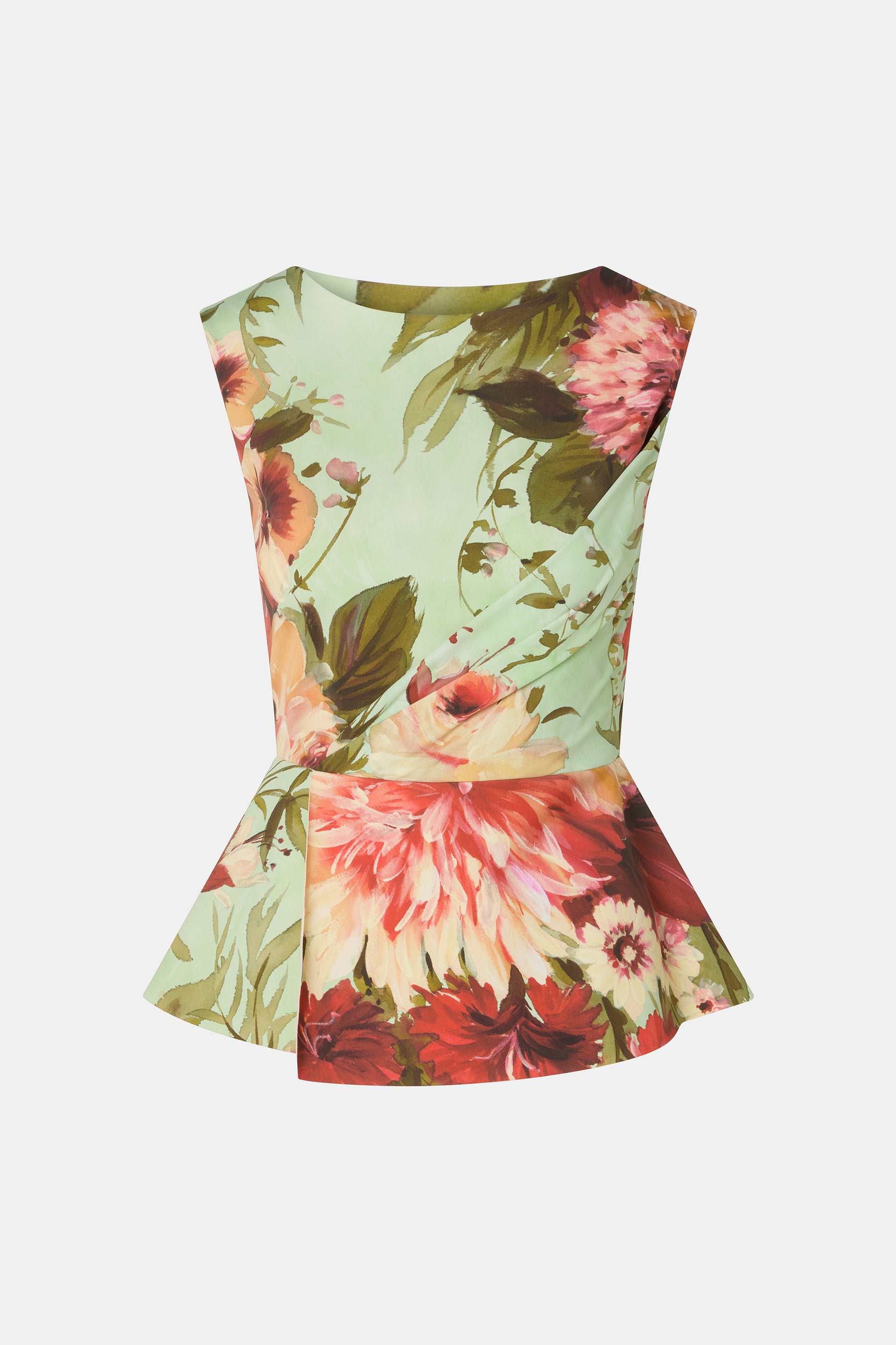 The printed Oliwia top, sleeveless with a waist peplum, exudes femininity and sophisticated style. Pair it with the matching trousers for an elegant, polished total look.