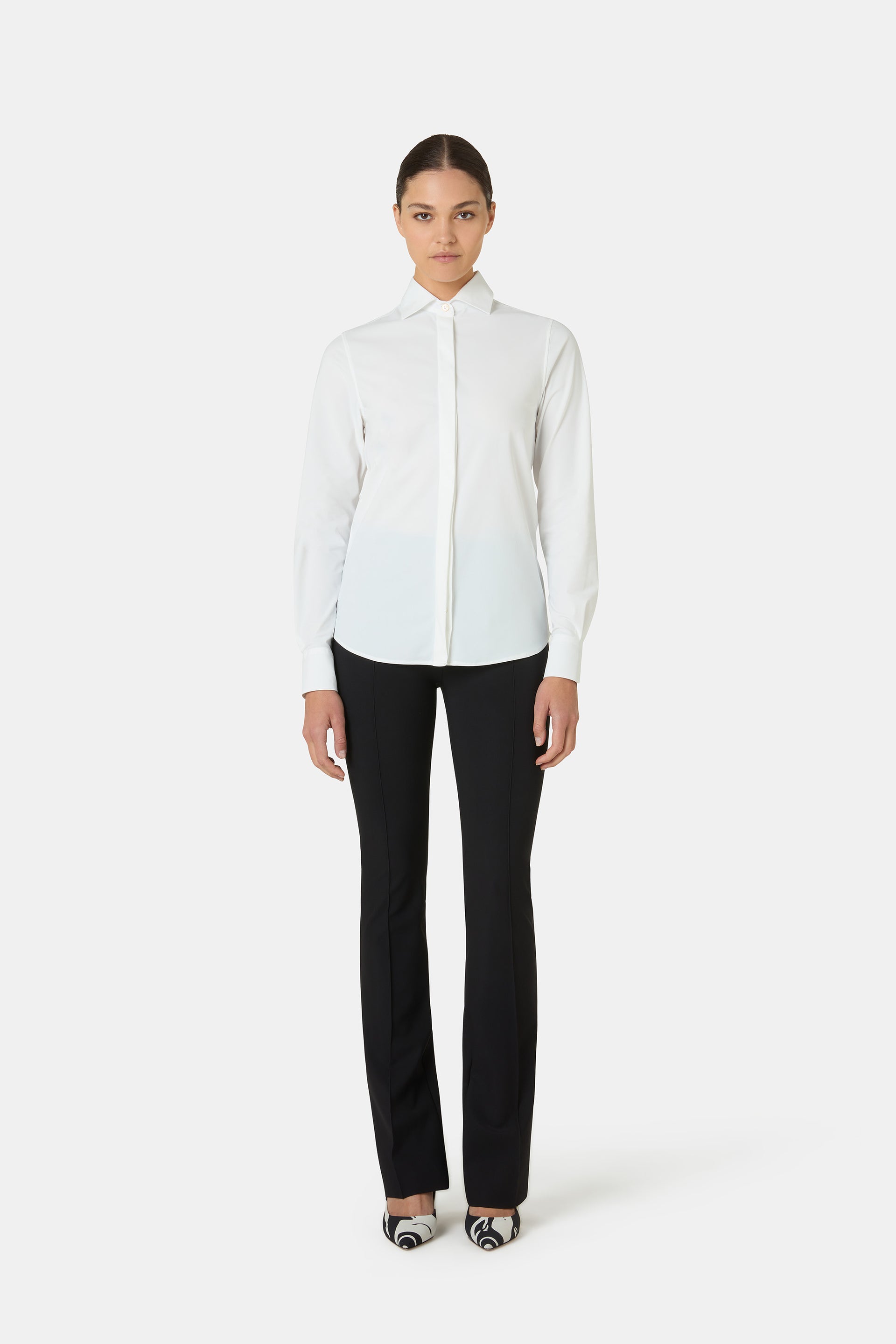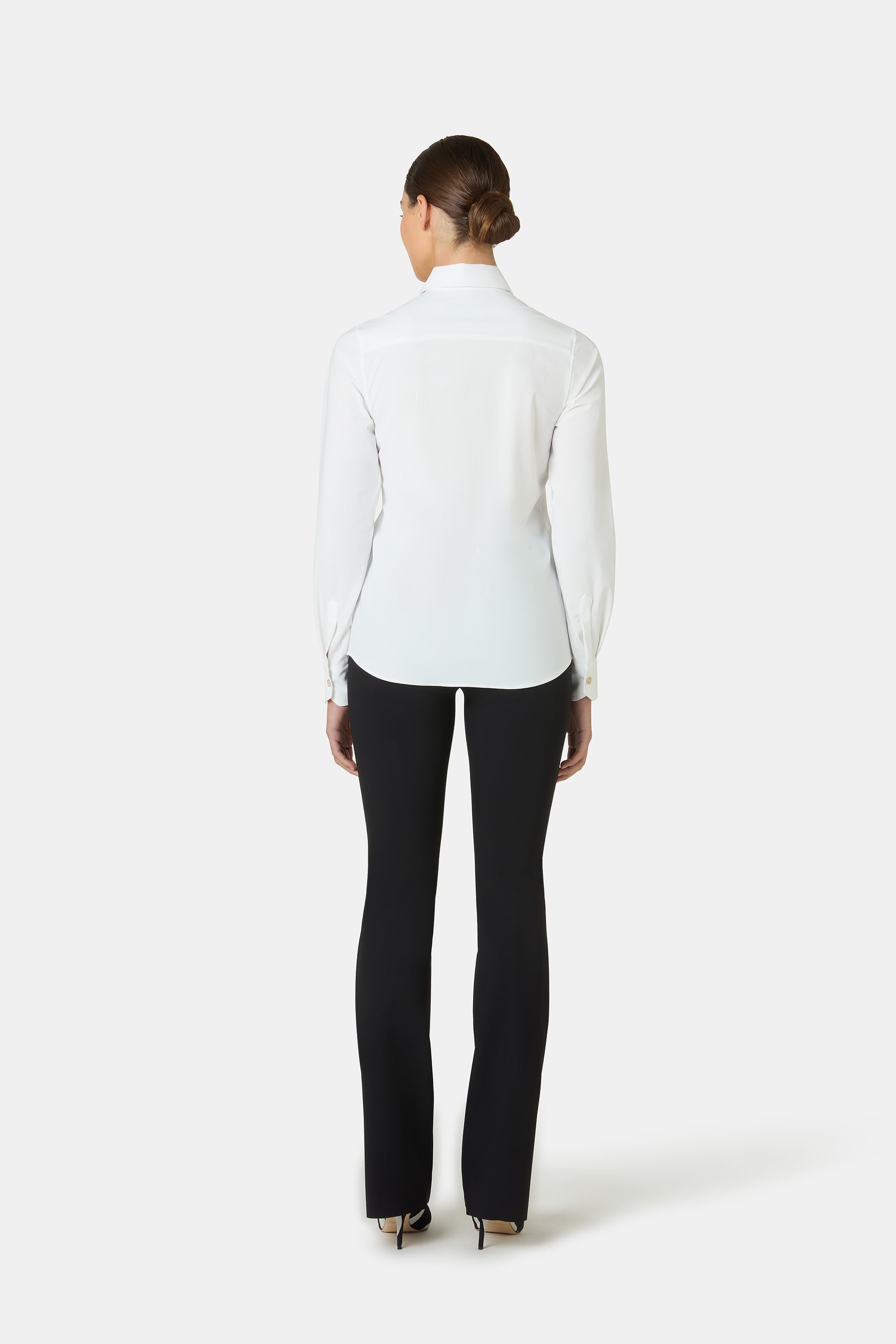 The Rosy shirt is a versatile and classy piece that offers exceptional comfort and an impeccable fit. The classic collar with bejeweled button and concealed button fastening make it perfect for creating a formal look or for everyday wear paired with skirts and pants. A must-have in every color option.