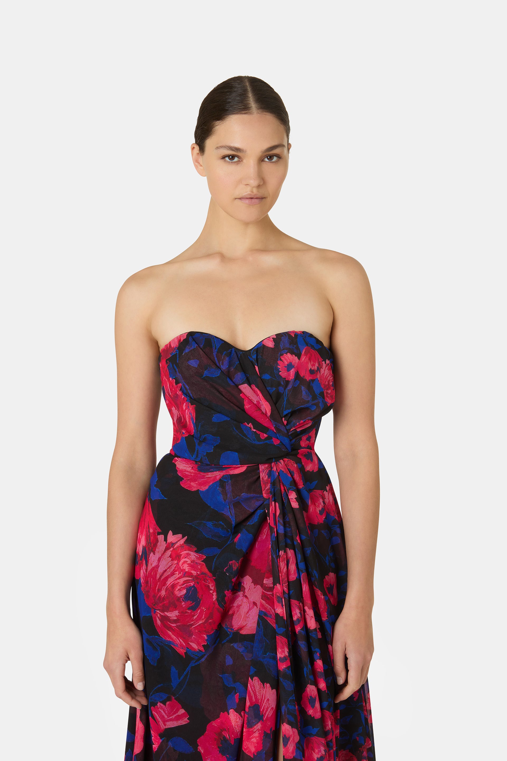 The Saml gown comes in a colorful seasonal print, merging the vibrancy of the colors with a silhouette that enhances the figure. The fitted bodice enhances the figure, while the full skirt with side slit adds a bold touch and sense of movement. Perfect for people who want to make their mark on a special evening, without sacrificing comfort and personality.