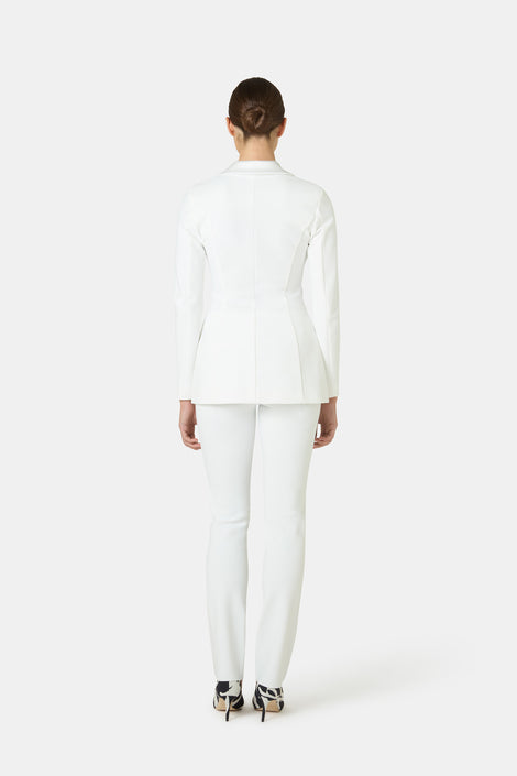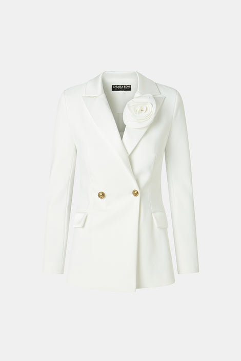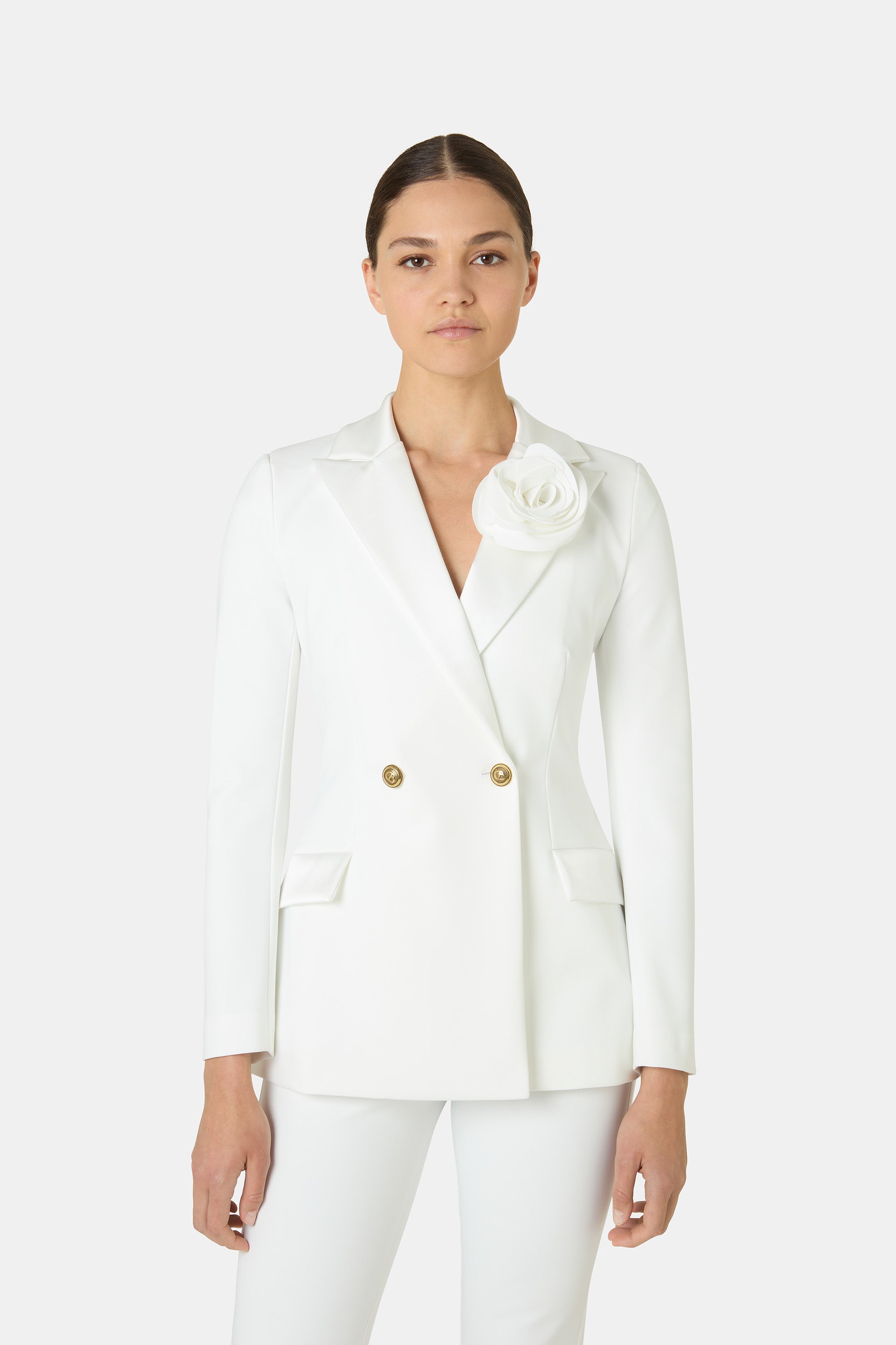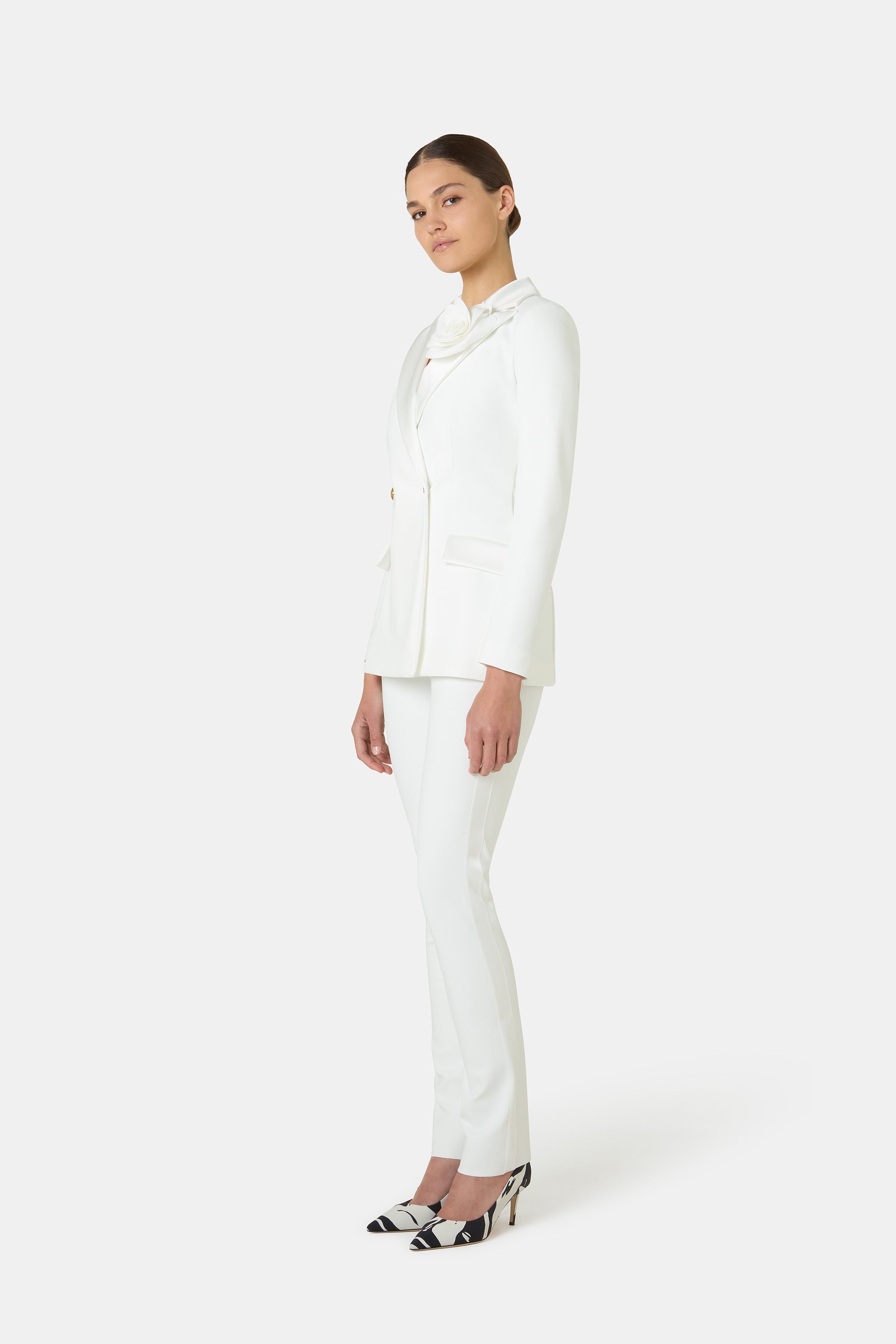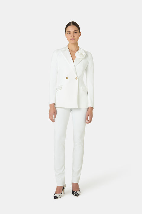 The Smoky jacket is a masterpiece of style and elegance. The double-breasted design and golden branded buttons embellish the piece, while the rose appliqué on the satin lapels is a distinctive and feminine detail. Pair with the pants with the satin band.