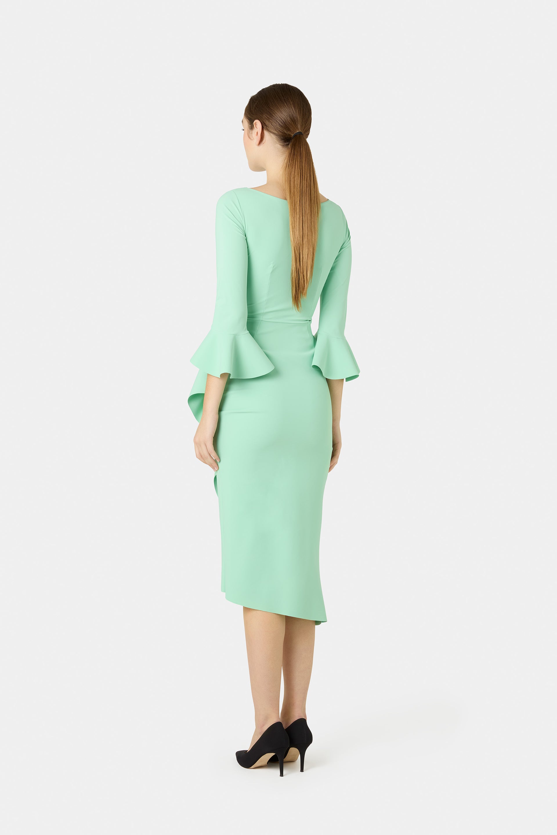 A romantic dress in true CHIARA BONI style. Flared cuffs, a maxi side ruffle, and a tulip-shaped skirt gracefully enhance the feminine curves
